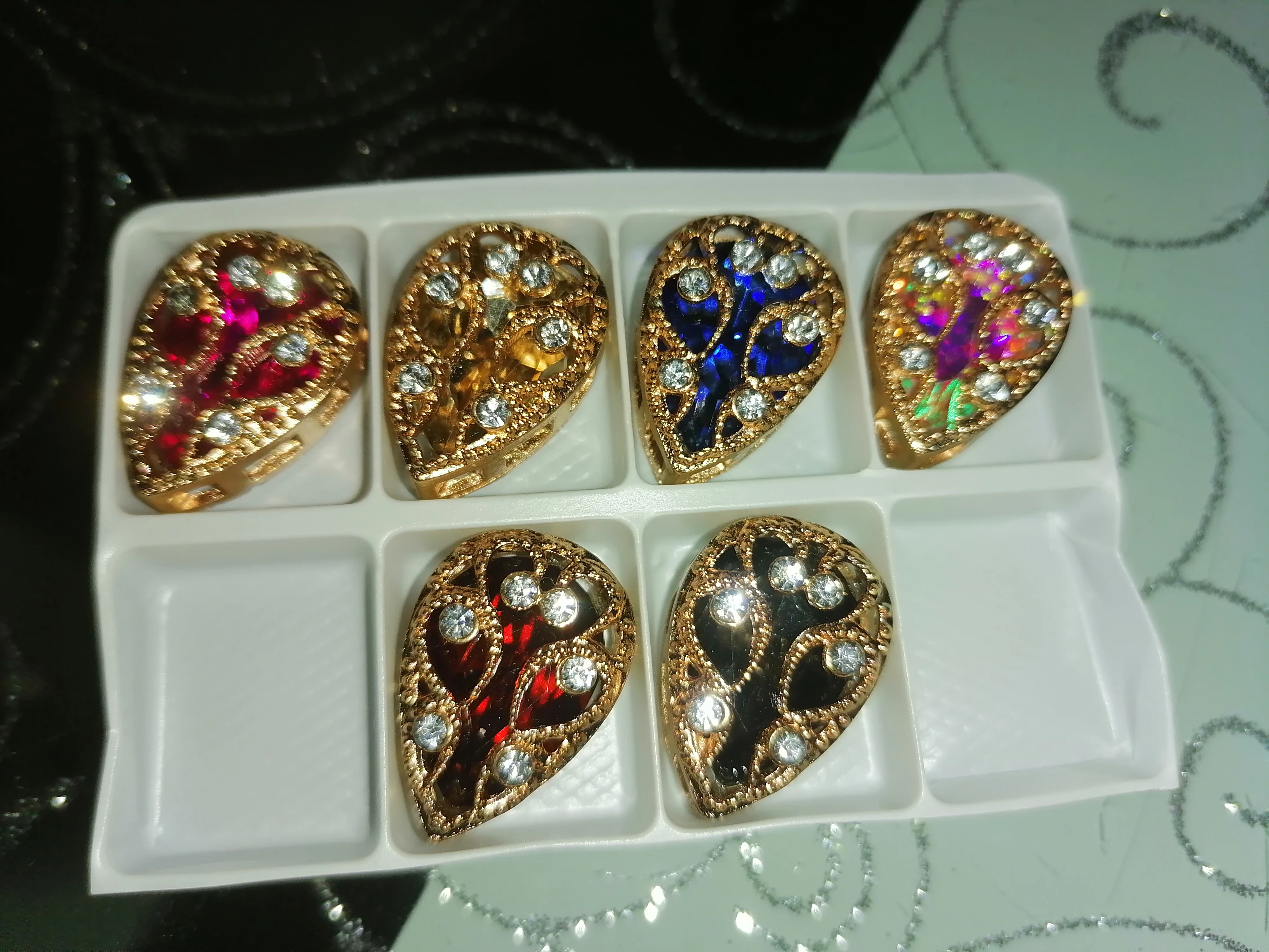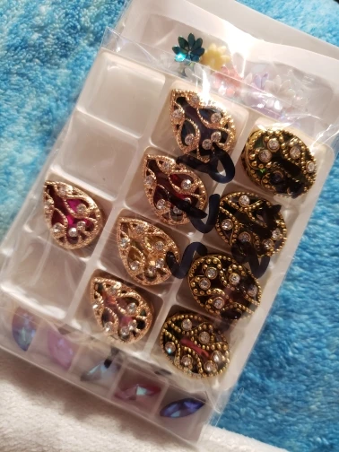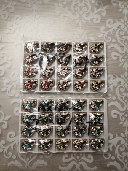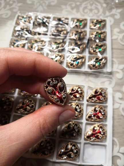 стразы просто ужасны оправа не металл а какой-то пластик, сама стразинка намного меньше оправы, и тупо туда клеем вклеена да еще и неровно, сомневаюсь даже что сама страза стеклянная, возможно и акрил за такие деньги такое ужасное качество это грабеж доехали очень быстро, с продавцом не общалась