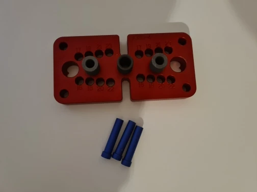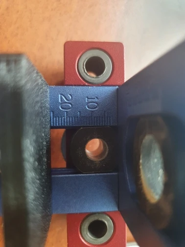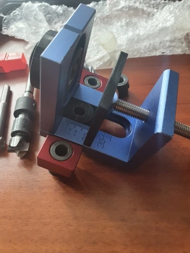 1.Одна втулка из закаленного металла, остальные из мягкого. 2. Нет подпятника у струбцины - портит деталь. 3. Три синие втулки входят в отверстия с большим зазором. 4. Вал forstner d=8 mm, а направляющая втулка д =10 мм. Идея хорошая, исполнение плохое.