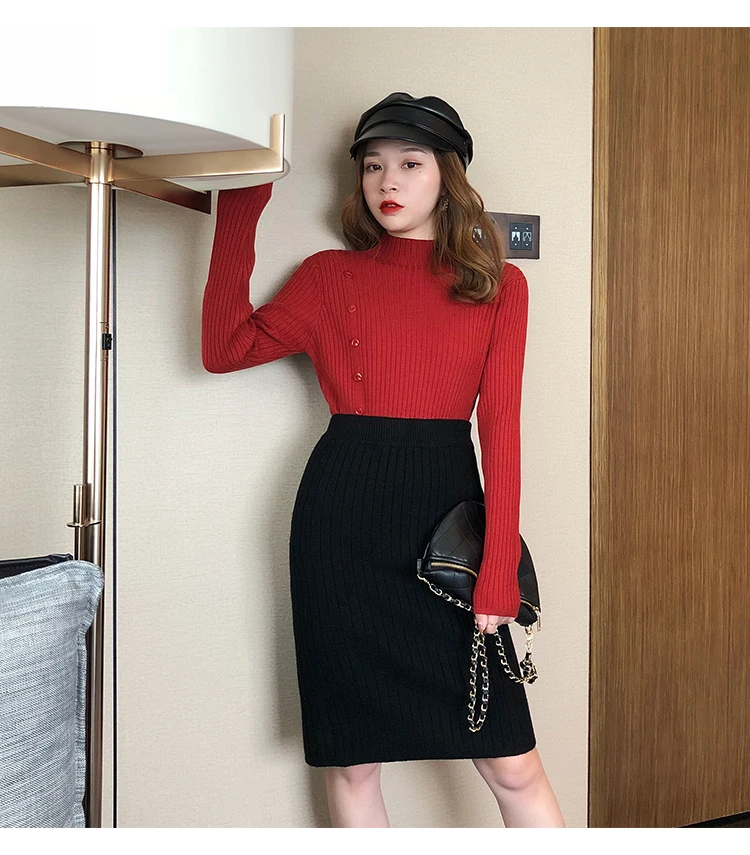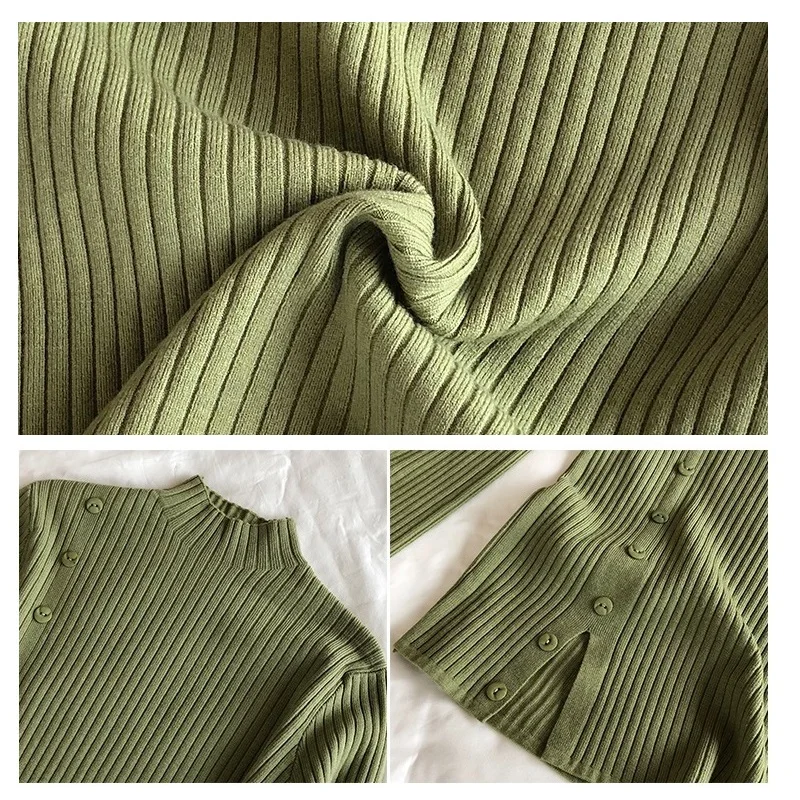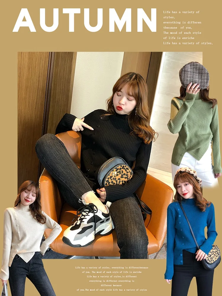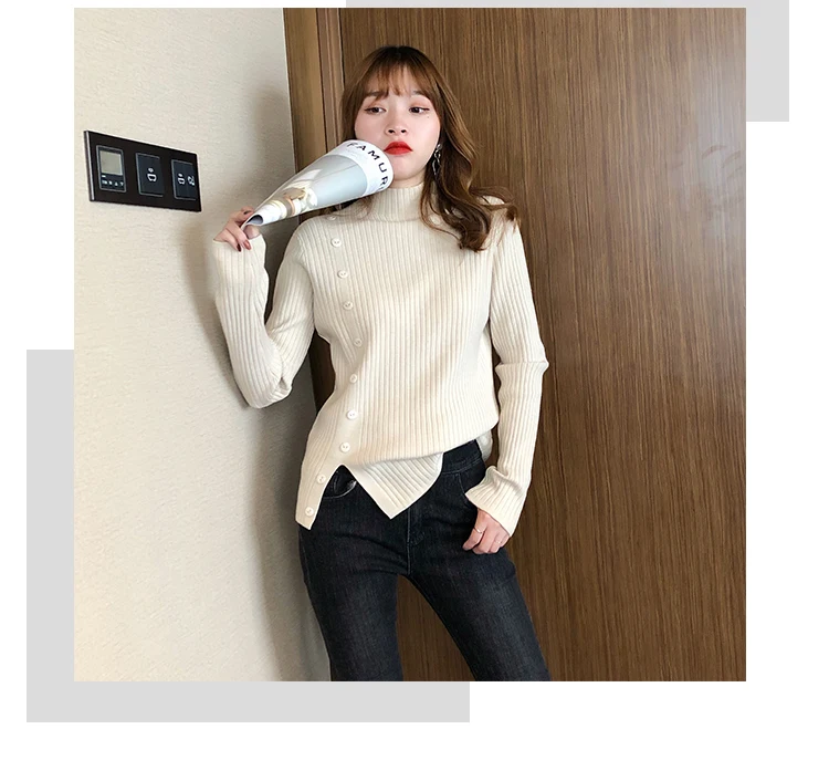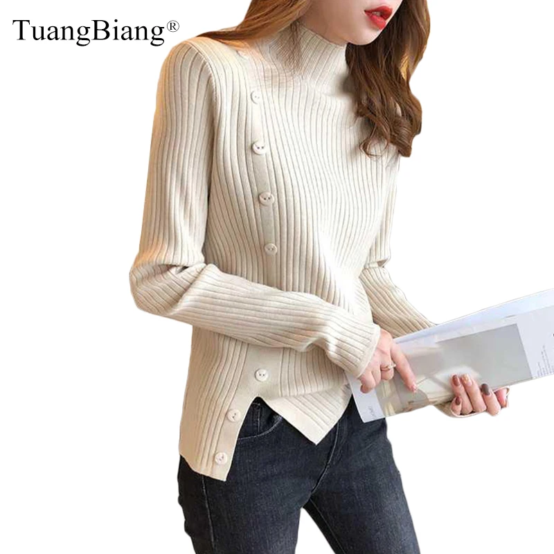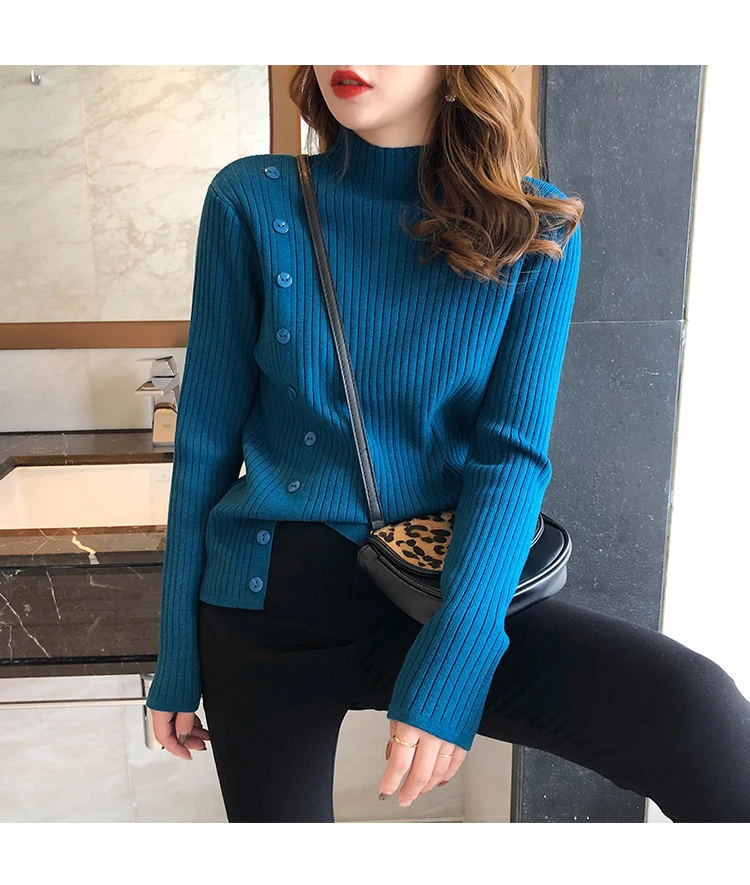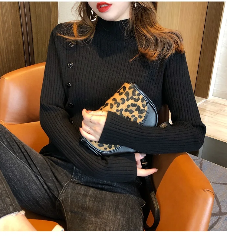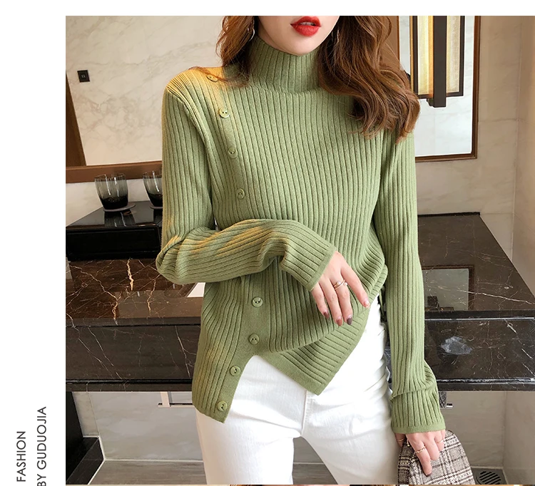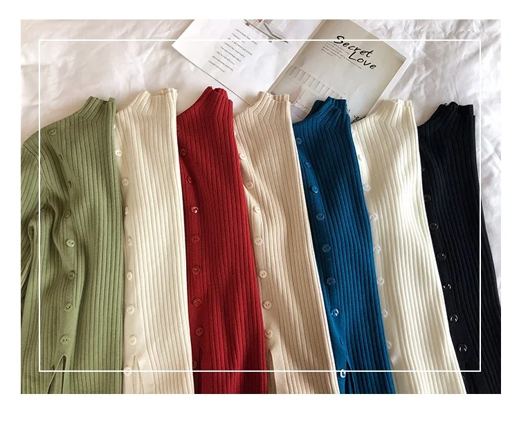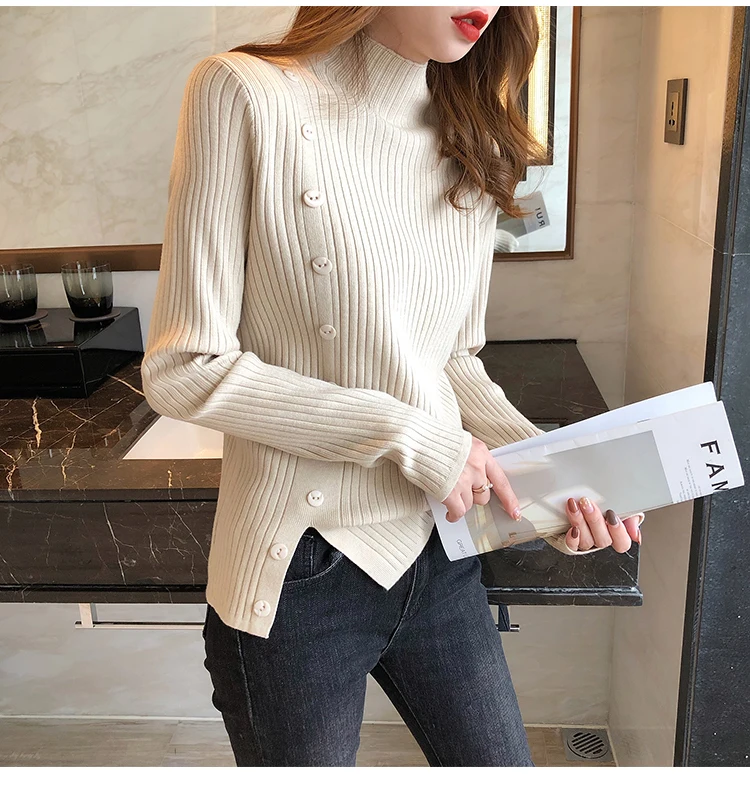 Женская водолазка на пуговицах, эластичный облегающий джемпер с длинным рукавом, мягкий шерстяной свитер с разрезом на подоле, осень-весна 2022