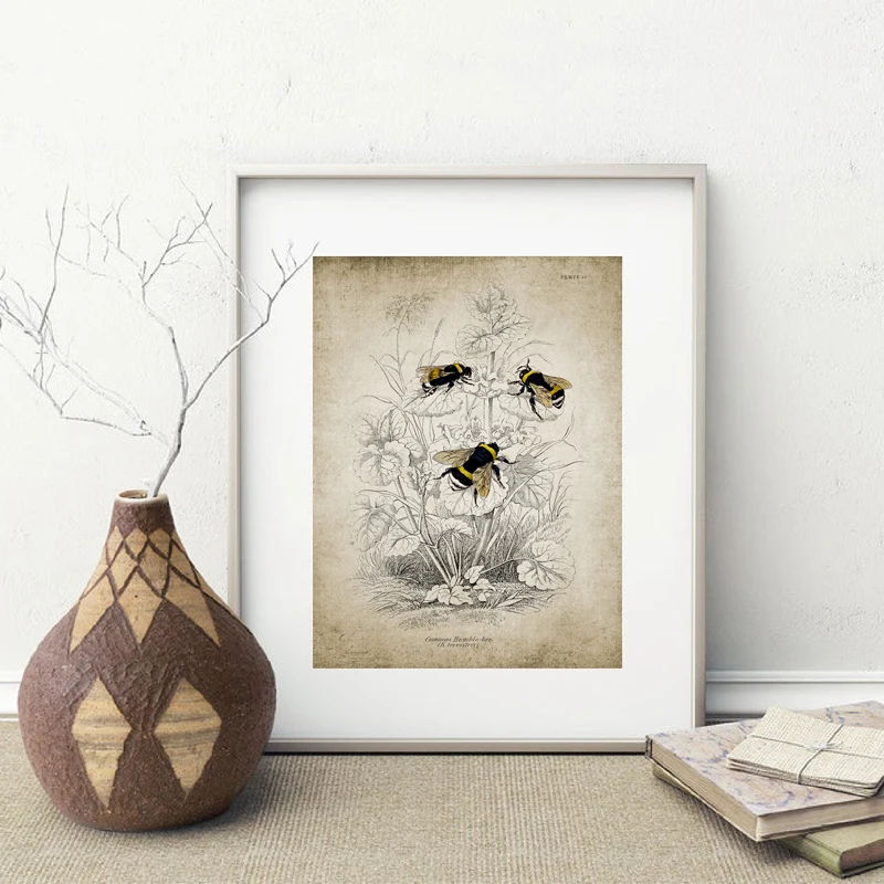 Винтажный Шмель, пчела, иллюстрация, художественный принт, пчела, плакат с изображением насекомых, сельский дом, Ретро стиль, настенная живопись на холсте, декор для гостиной