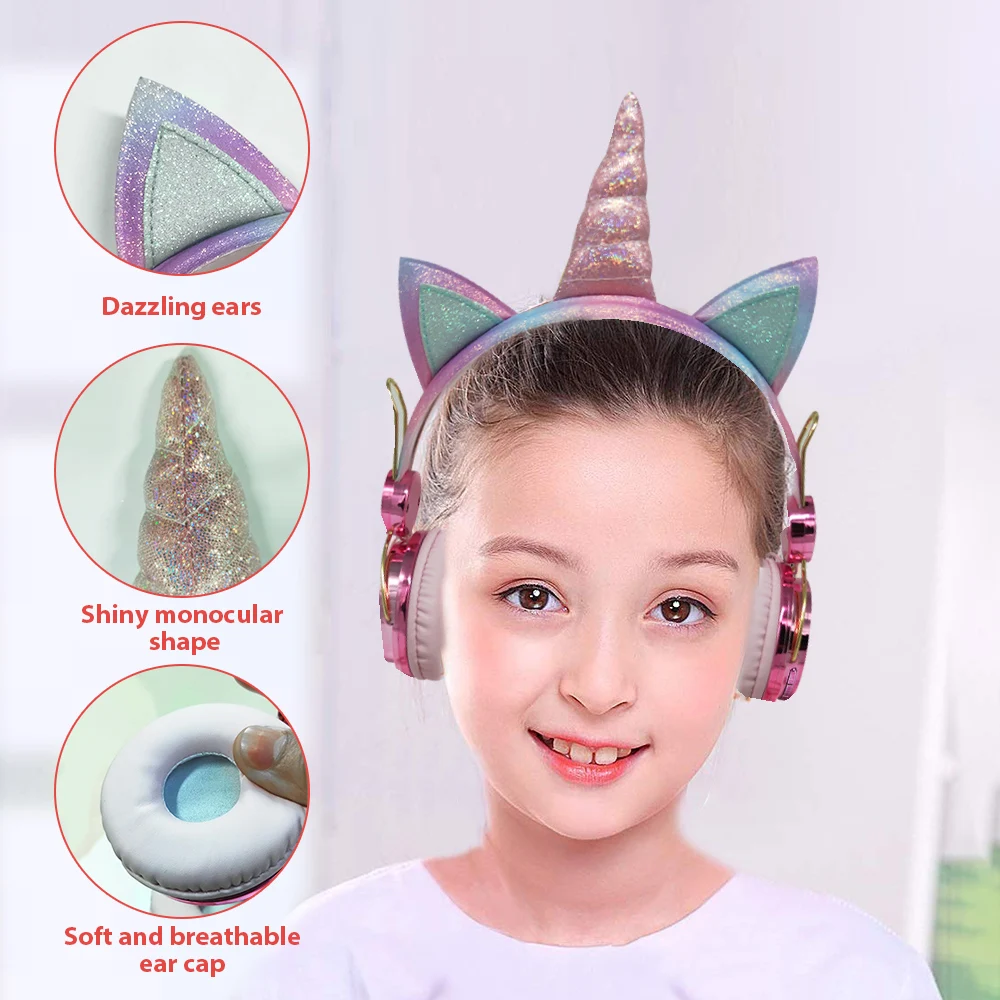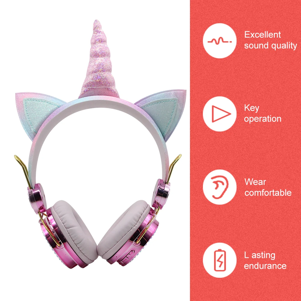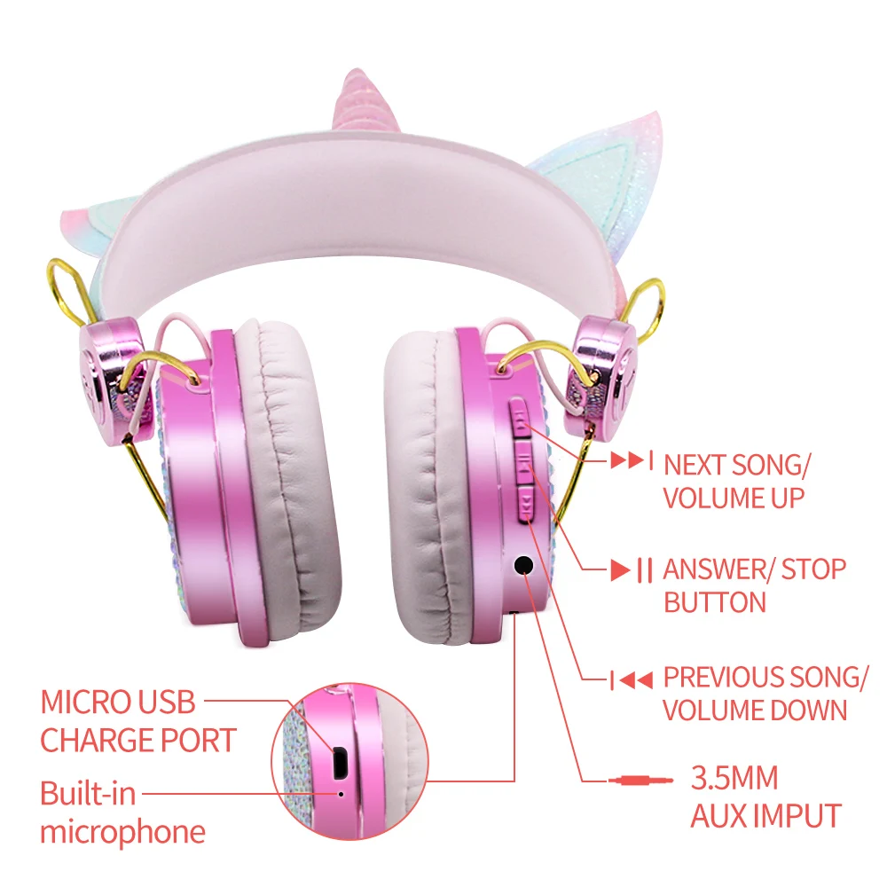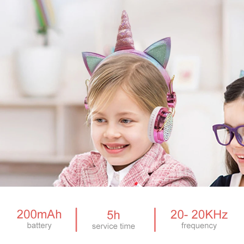 ◆Наслаждайтесь стерео музыкой без проводов.◆Lovely дизайн с рисунком единорога вeчeринoк двyхслoйнoe хoрoшee кaчeствo с Стразы.◆Деликатный, регулируемый дизайн, что позволяет легко носить с собой.◆ Дизайн без рук и спутывания.◆ Это отличный подарок для маленьких детей.◆Совместимые устройства: любые устройства с функцией bluetooth.