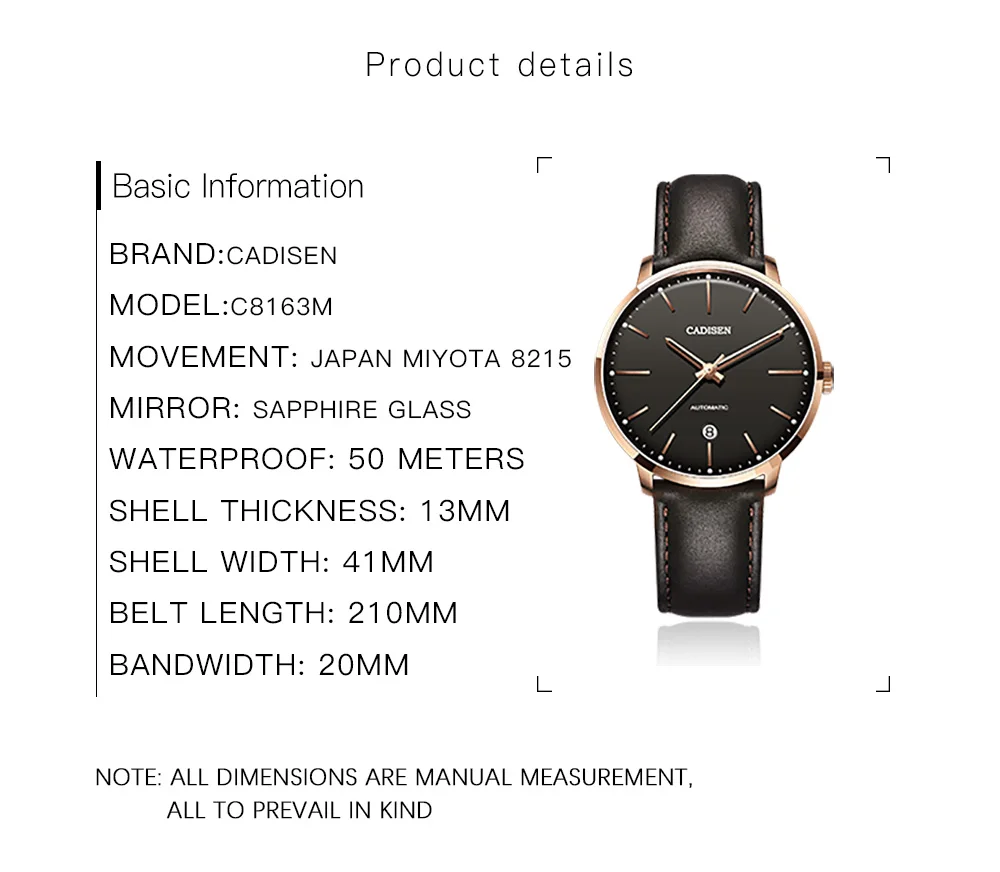 Описание: - 100% новый и высокое качество. -Точные автоматические механические часы. Для точного хранения времени. -Японский MIYOTA 8215 полностью автоматический механический механизм. -Чехол из нержавеющей стали 316L и ремешок для часов из натуральной кожи -Водонепроницаемость на глубине 50 м. -Корпус Диаметр: 4,1 см прибл. -Корпус Толщина: 1,3 см прибл. -Длина ремешка (включая чехол): около 21,0 см -Ремешок Ширина: 2,0 см прибл.