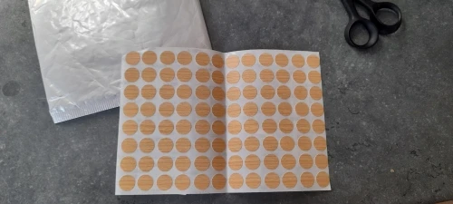 давно хотели такие наклейки, удачно подобрали цвет и размер, заказ пришел быстро - 25 сентября было заказано, 12-го октября получены, не знаю - как долго и крепко будут держаться, поэтому на всякий случай заказали два листа, пока выглядит супер - практически не видно на панелях (последнее фото), однозначно рекомендую к покупке, если вам не нравятся пластиковые заглушки на мебели и респект продавцу )))