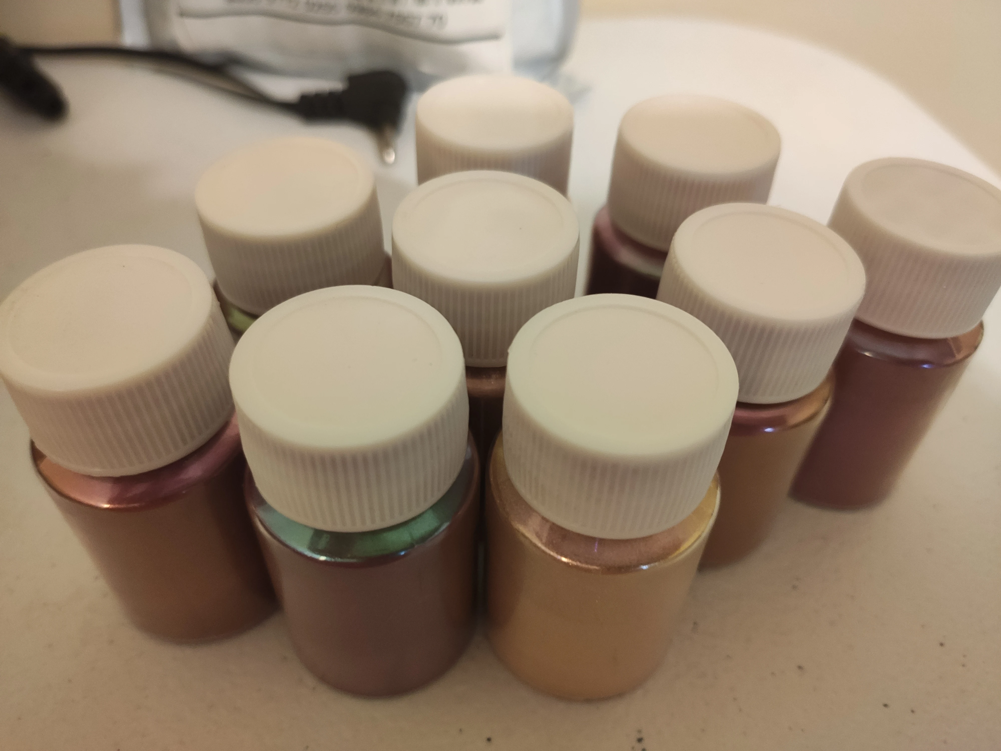 Цвета не очень соответствуют картинке, но все равно, просто шикарны. На деле все пигменты гораздо темнее, чем на фото. Заказала все 9 сразу. Посылку ждала чуть больше 3 месяцев. Некоторые баночки (5 штук) оказались вскрытыми. Ничего не рассыпалось, упаковано нормально. Эти пигменты стоило подождать. Рекомендую