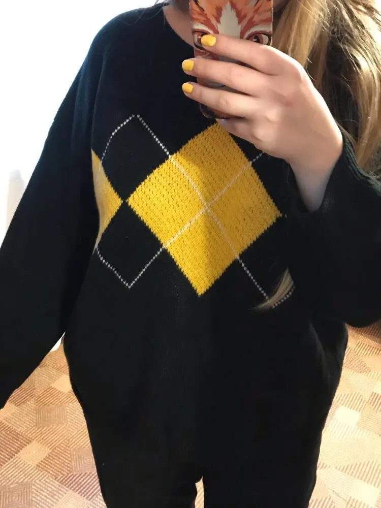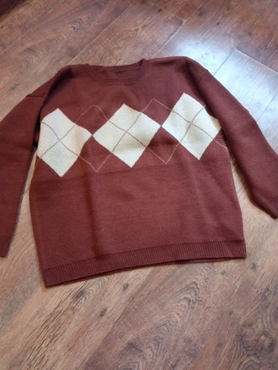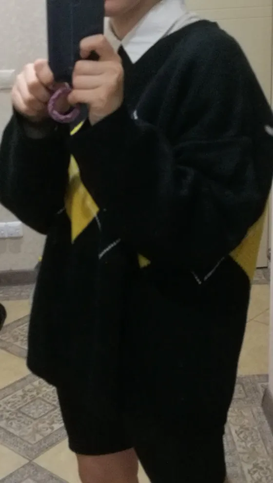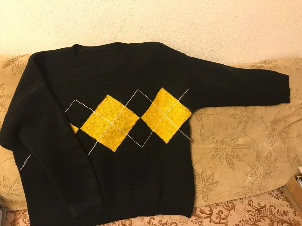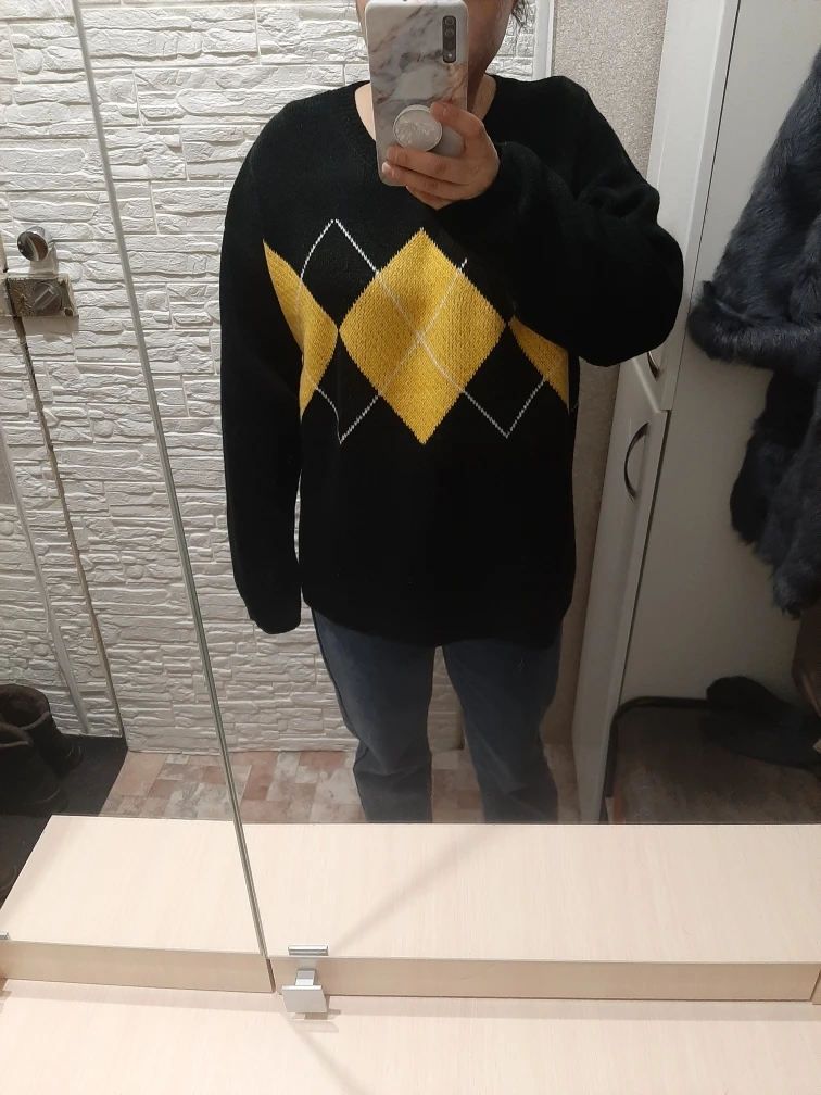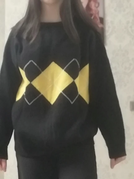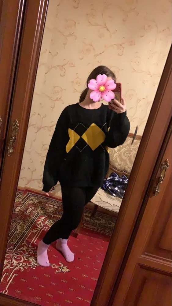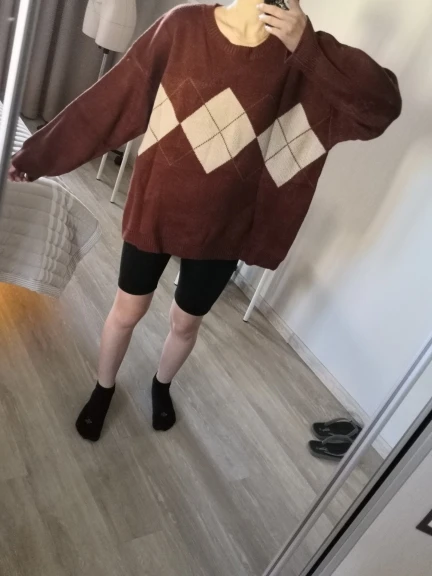 оплатила 24.12 отправили 25.12 получила 06.01 Покупала за 1192,10руб Доставка AliExpress Standard Shipping бесплатная. Трек отслеживался. При открытии ничем не пахла. На 42-44 размер (88-78-93см), рост 156см. Кофта села как оверсайз, но мне это нравится. Отлично скрывает недостатки фигуры. По длине ниже попы. Рукава длинные. Выполнен качественно, ромбики яркие. Сразу понятно, что после стирки появятся катышки. В общем покупкой довольна