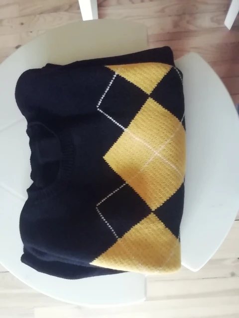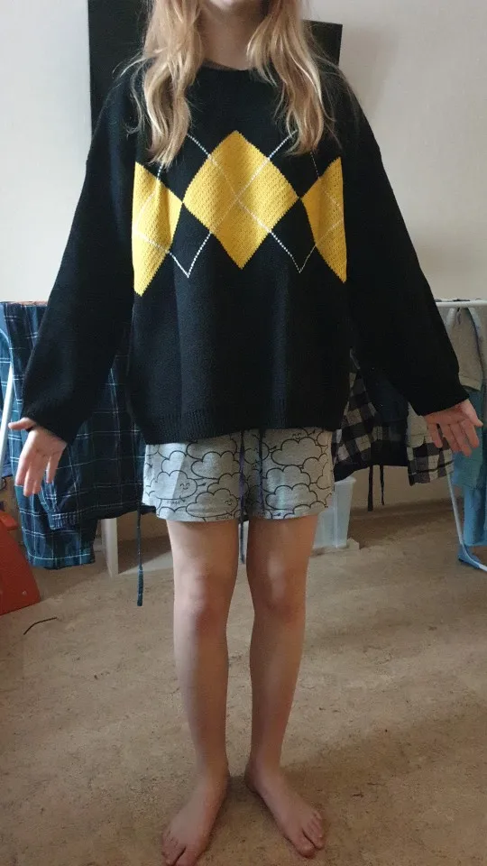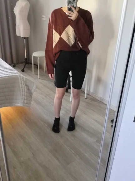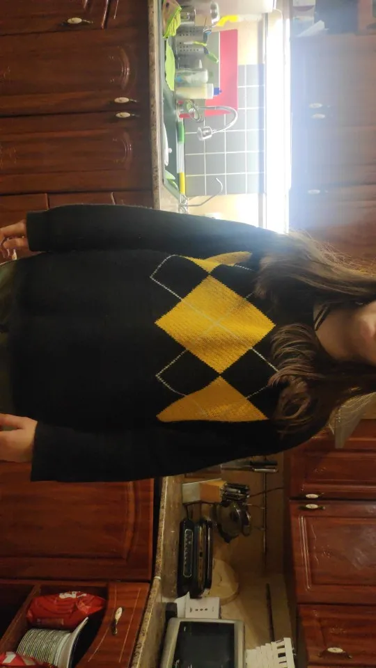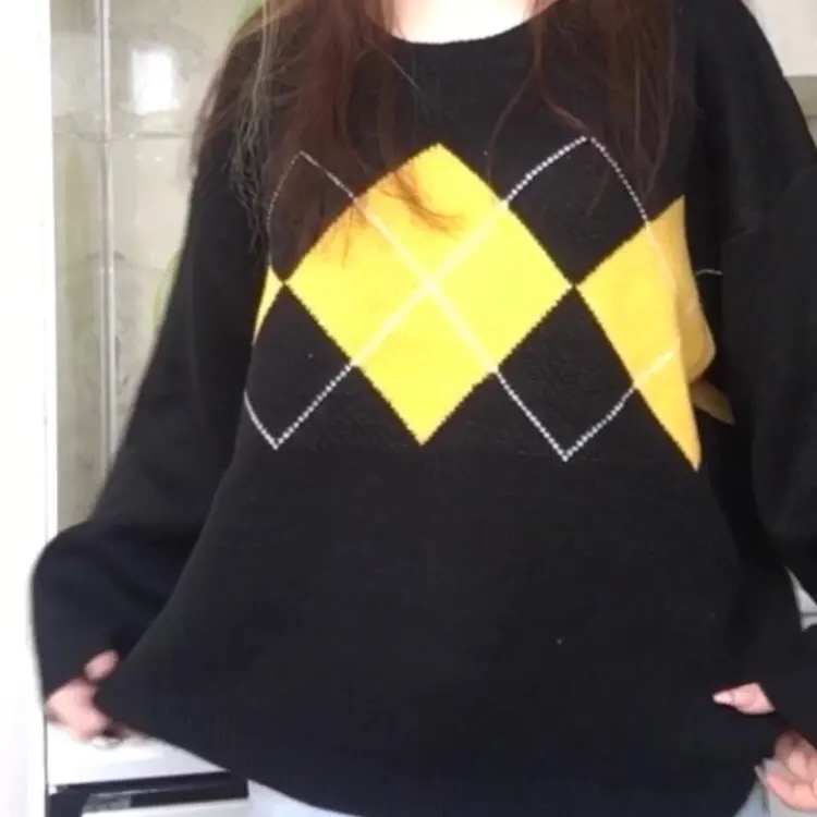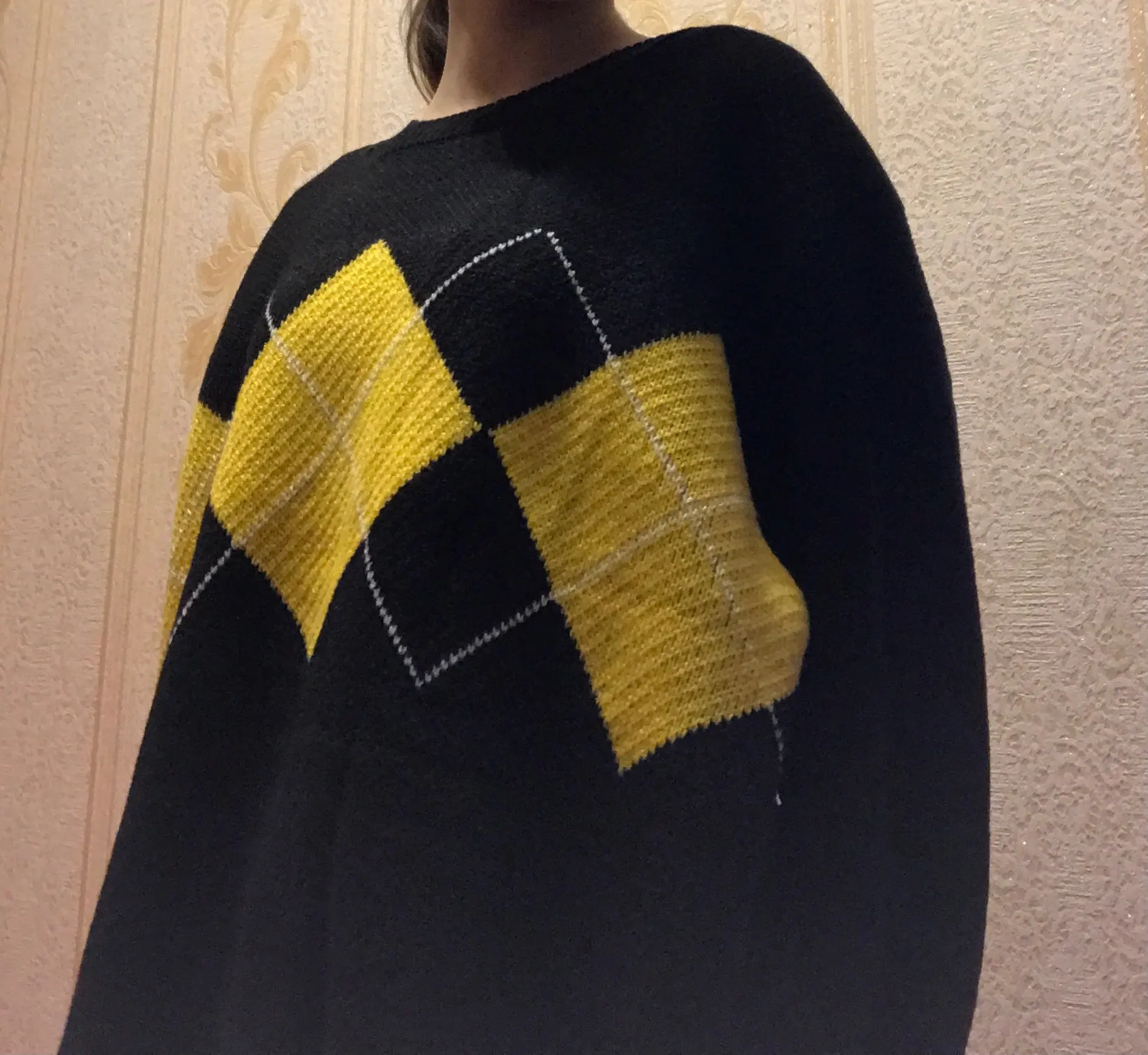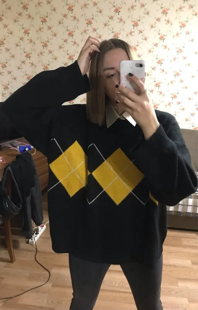 оплатила 24.12 отправили 25.12 получила 06.01 Покупала за 1192,10руб Доставка AliExpress Standard Shipping бесплатная. Трек отслеживался. При открытии ничем не пахла. На 42-44 размер (88-78-93см), рост 156см. Кофта села как оверсайз, но мне это нравится. Отлично скрывает недостатки фигуры. По длине ниже попы. Рукава длинные. Выполнен качественно, ромбики яркие. Сразу понятно, что после стирки появятся катышки. В общем покупкой довольна