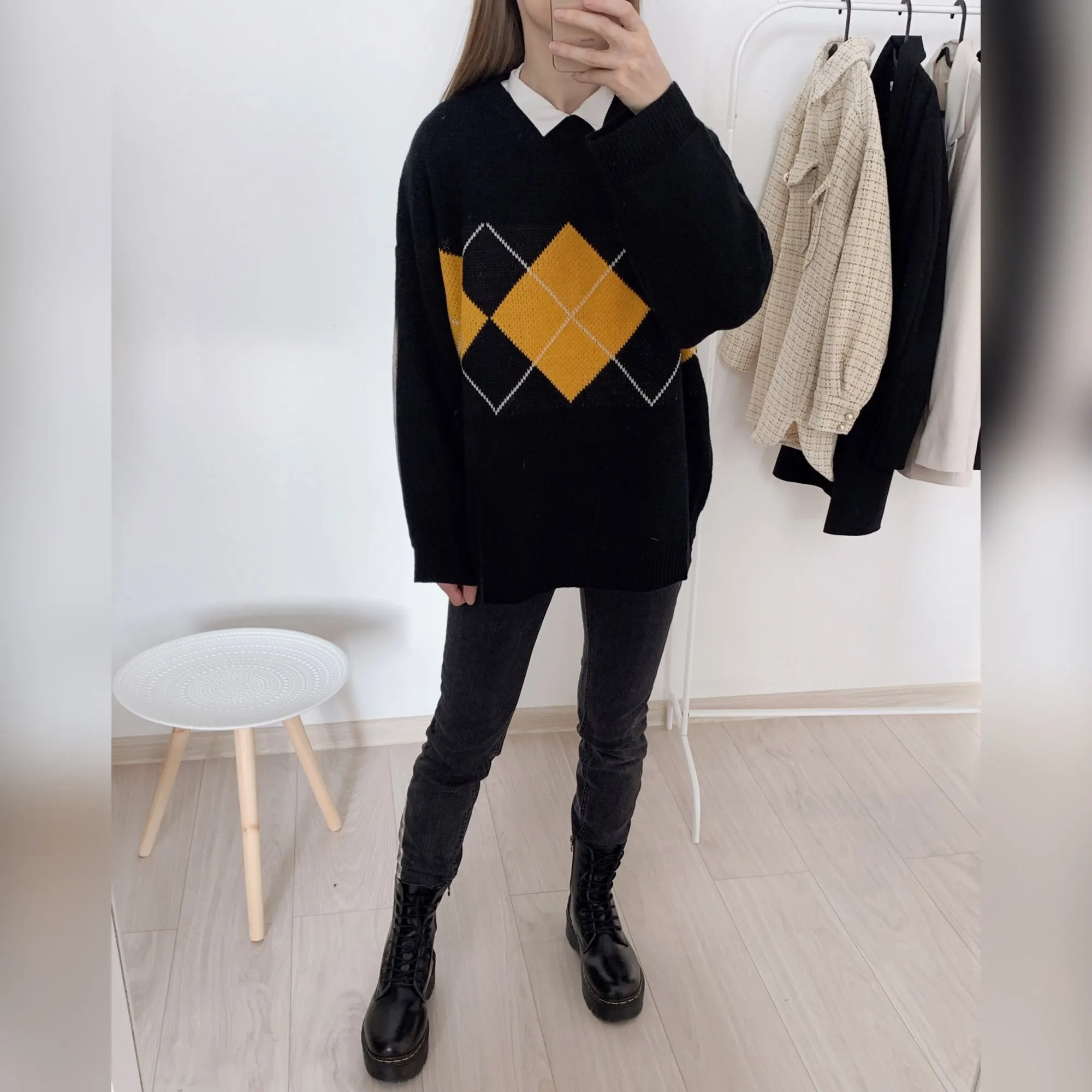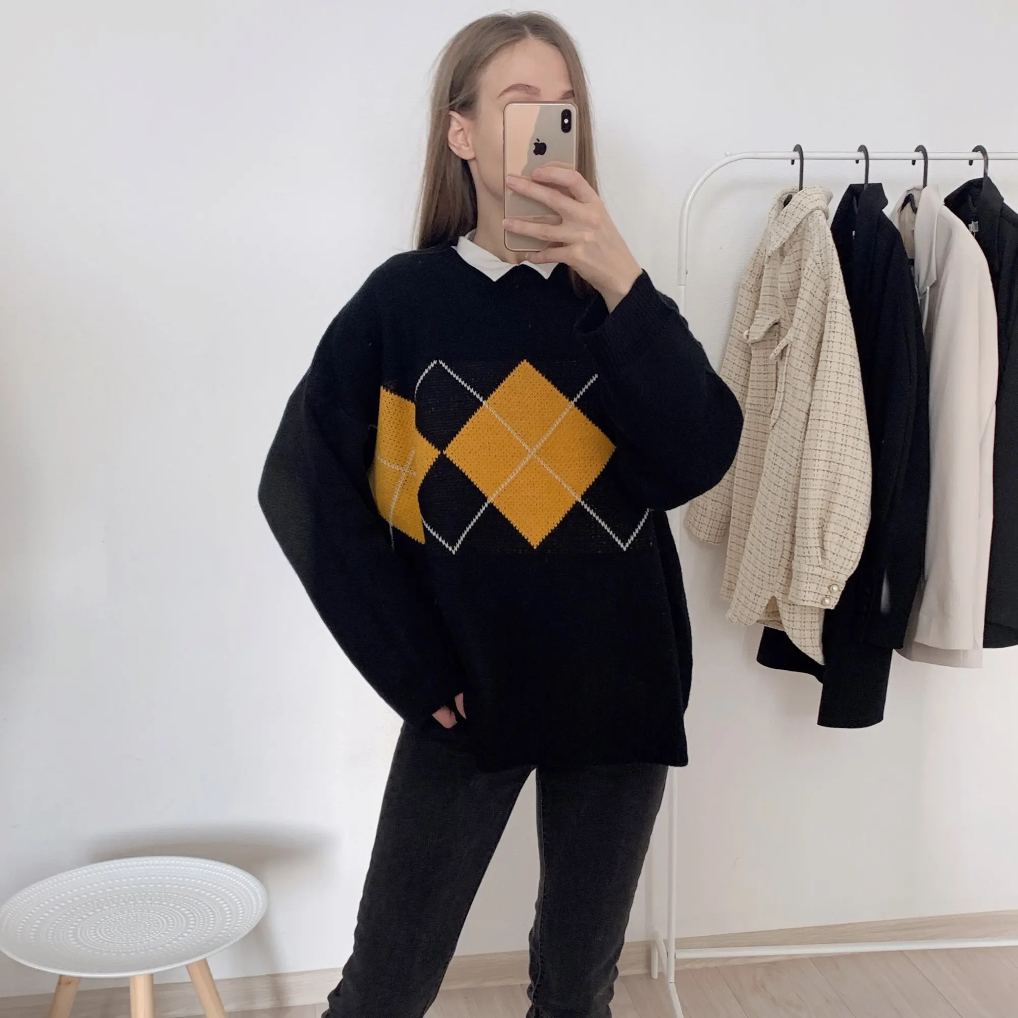Женский трикотажный свитер, свободный джемпер оверсайз с геометрическим узором, круглым вырезом, в Корейском стиле на осень и зиму, пуловеры с ромбовидным узором