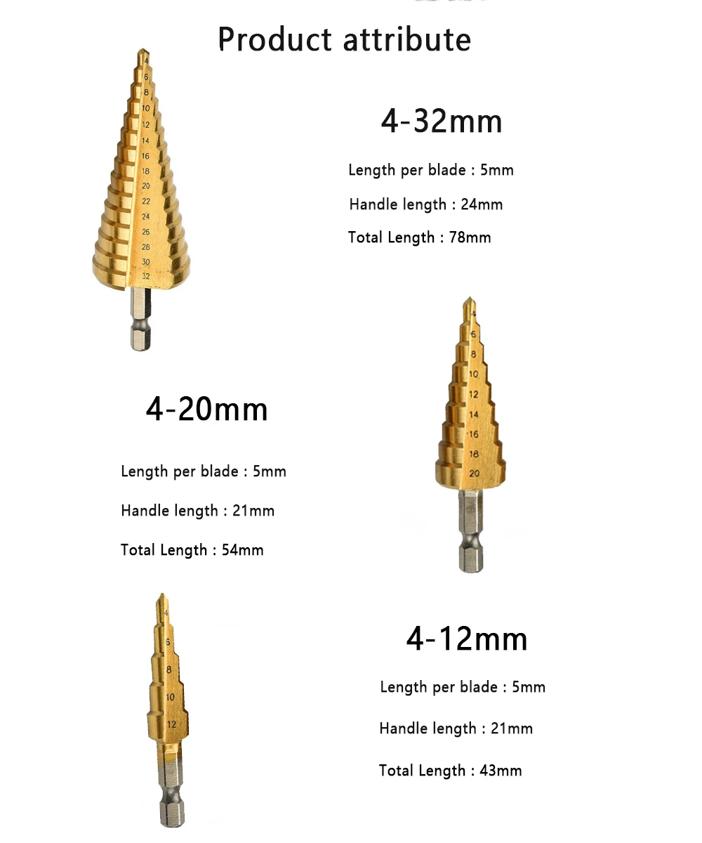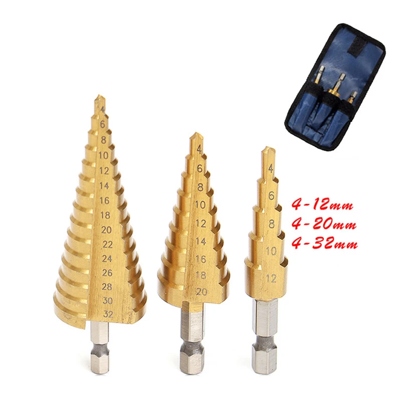 Ступенчатое сверло 4 размера из быстрорежущей стали с титановым пок...