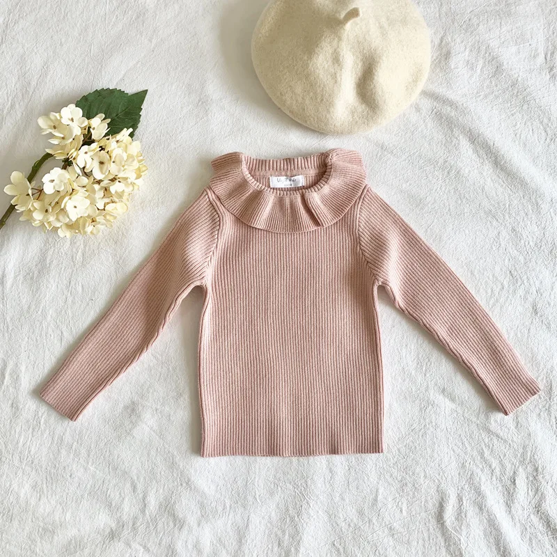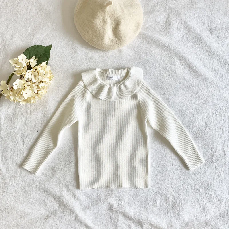 Детский трикотажный свитер в рубчик, с оборками на воротнике