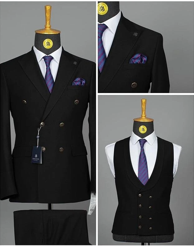 Новейший дизайн, черные формальные двубортные мужские костюмы, смокинги для жениха, Свадебные Мужские костюмы (пиджак + брюки + жилет + галстук)