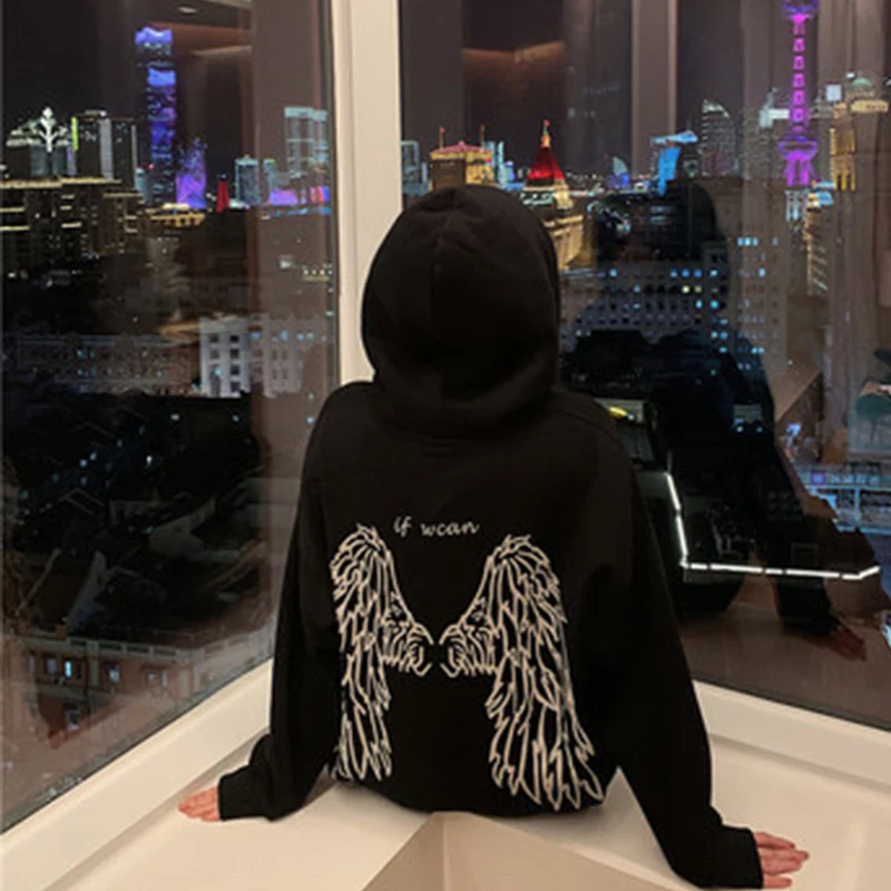 Женский пуловер с капюшоном в уличном стиле с принтом крыльев Ангела на спине, худи в стиле панк, одежда для альбома, Топ для дома