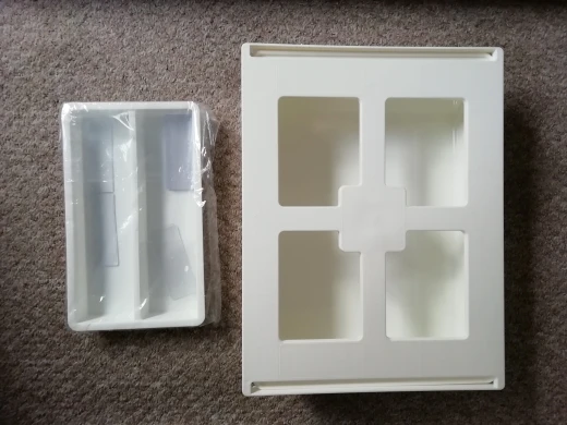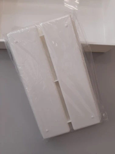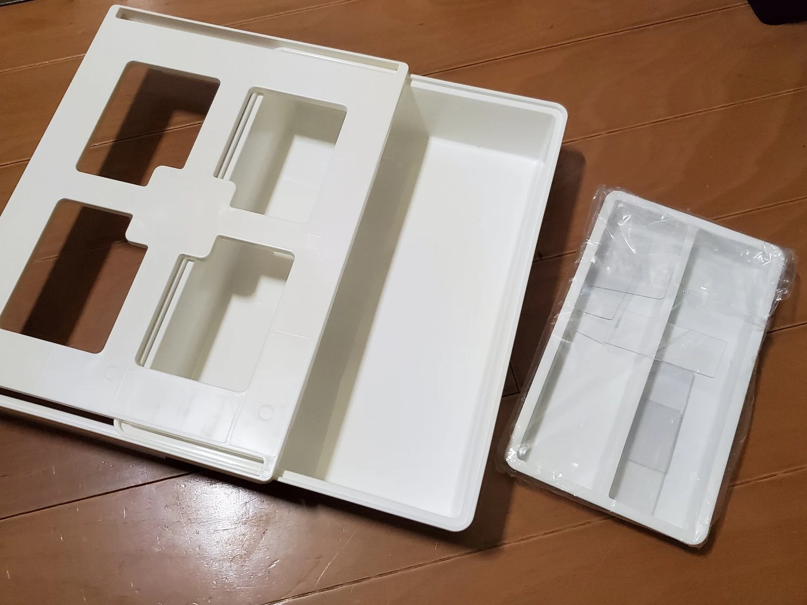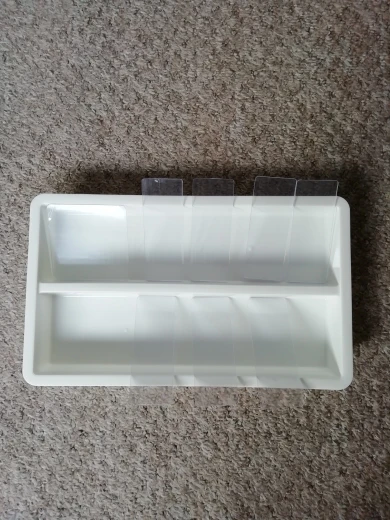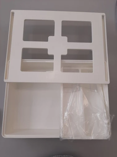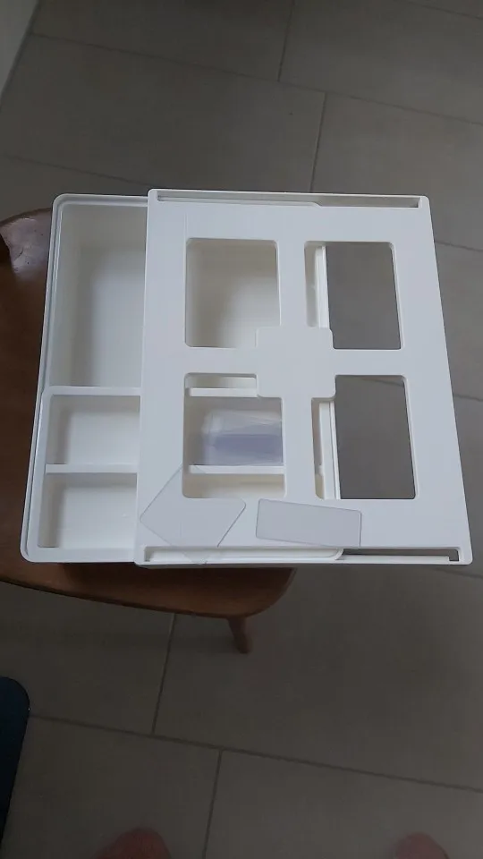 Ящик полностью соответствует описанию. Состоит и рамы, ящика, подвижного отделения и 8 кусочков двустороннего скотча для крепежа (1 запасная). Пришел без повреждений: продавец откликнулся на мою просьбу и упаковал в воздушный пакет. Я довольна ящиком.. Продавец отзывчив, потому смело заказывайте, но не забывайте задавать вопросы. товар и продавца рекомендую!