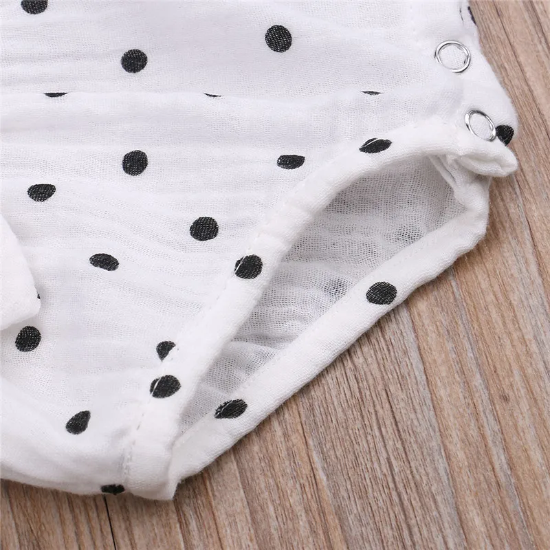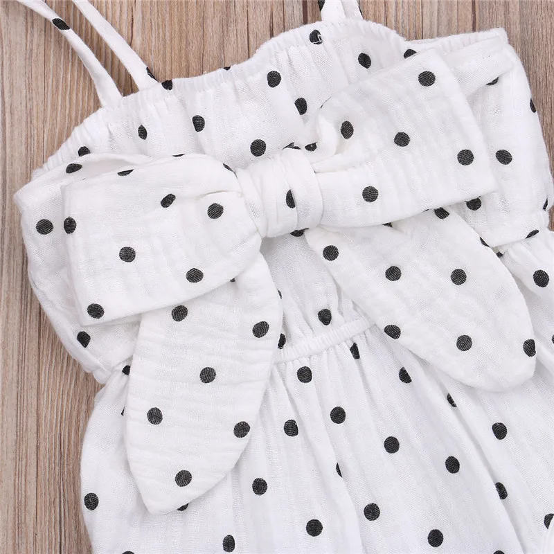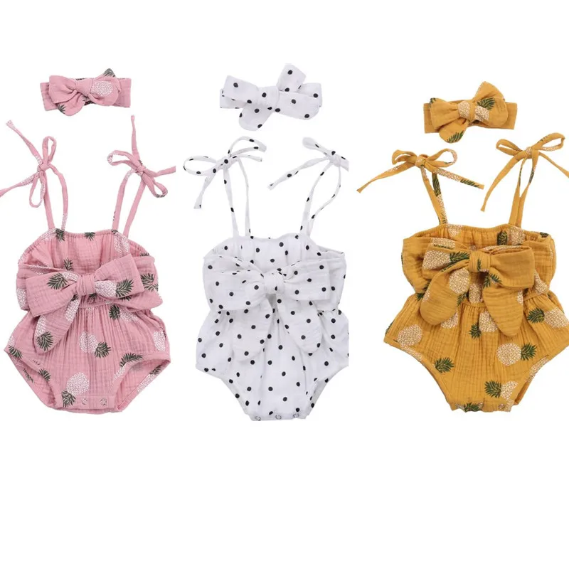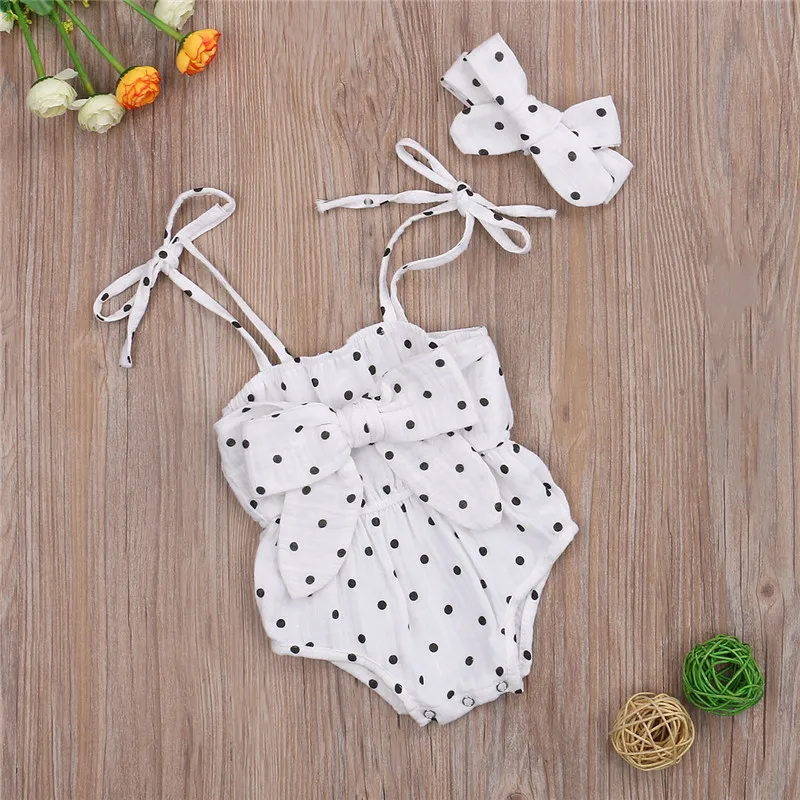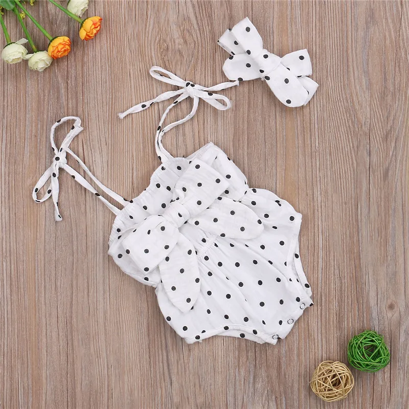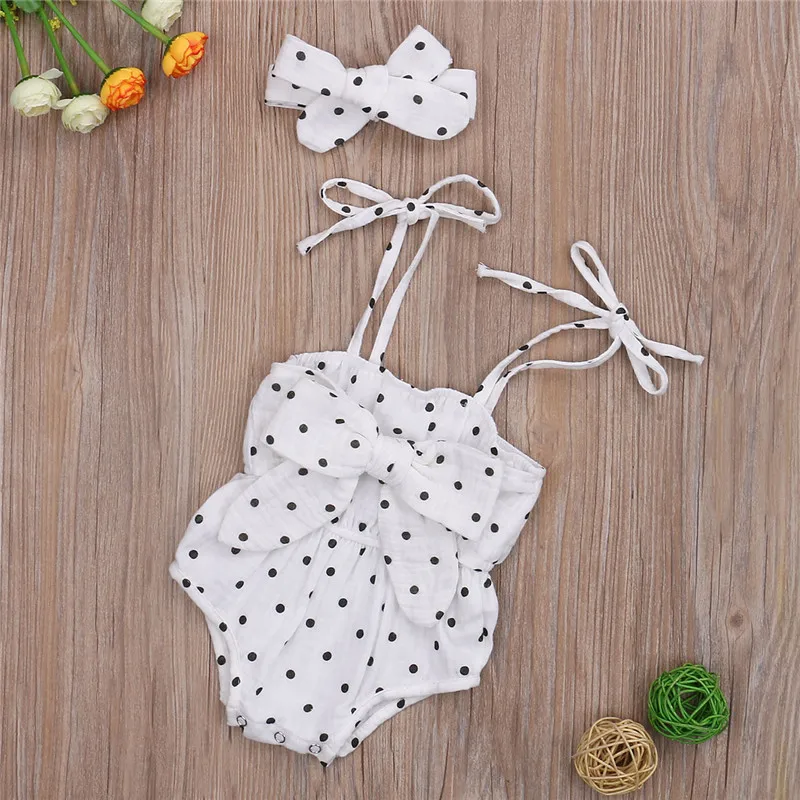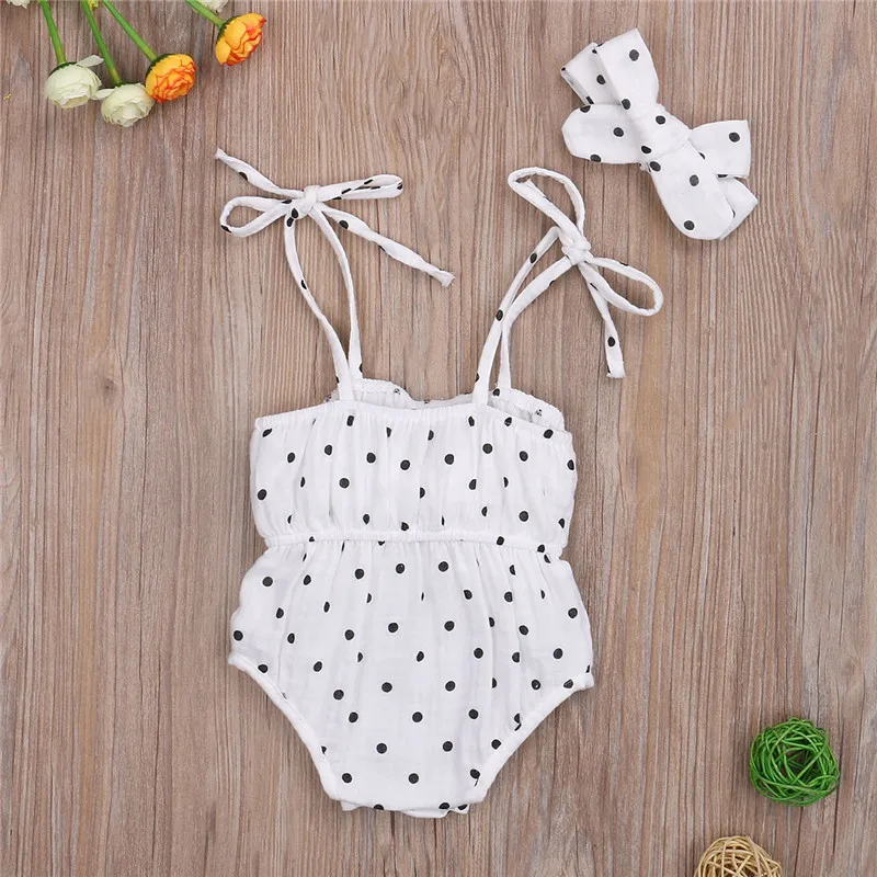 Комбинезон для маленьких девочек 0-24 мес., повязка на голову, 2 шт., комбинезоны без рукавов с цветочнымв горошек и бантом на поясе, комбинезон на лямках из хлопка для маленьких девочек