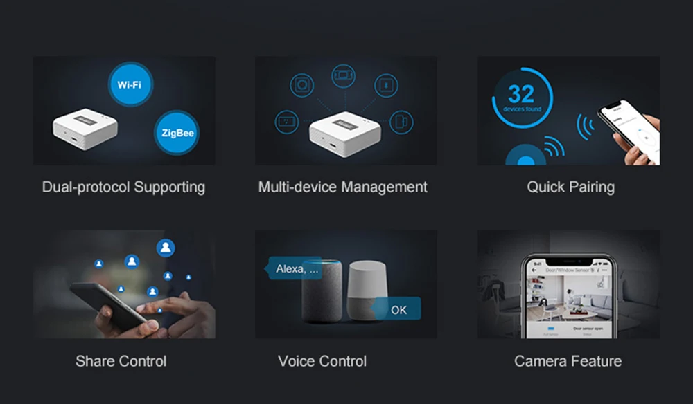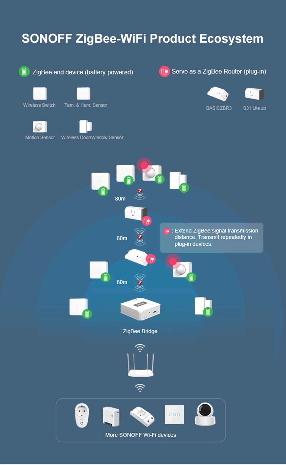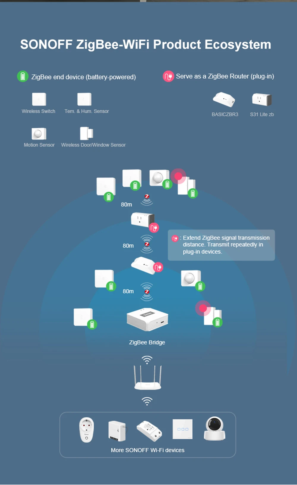 SONOFF ZigBee Bridge-это сердце умного дома, которое позволяет удаленно управлять различными устройствами и датчиками ZigBee для мониторинга и управления дома, И позволяет создавать интеллектуальные сцены, чтобы Интеллектуальные устройства Wi-Fi и ZigBee общались, чтобы получить доступ к умному дому и управлять ими с помощью приложения eWeLink. Он максимизирует эффективность для до 32 подключенных подустройств, которые представляют собой переключатели на основе ZigBee, вилки и датчики безопасности. Умный переключатель SONOFF BASICZBR3 Wi-Fi, умная вилка S31 zb Lite, беспроводной переключатель SONOFF SNZB-01 и датчик s, например, датчик температуры и влажности SNZB-02, SNZB-03 датчик движения и SNZB-04 беспроводной датчик двери/окна могут быть подключены к мосту, чтобы дать вам возможность создать различные связи сцены. Что касается других поддерживаемых устройств, мост также может работать с одногрупповым умным переключателем, датчиком температуры и влажности, датчиком движения, беспроводным датчиком двери/окна и датчиком воды, которые сертифицированы ZigBee Alliance. Сопряжение всех подустройств одним касанием, быстрее, чем сопряжение по Wi-Fi. Он поддерживает добавление камеры на мостике или на вспомогательном устройстве, что удобно для просмотра вашего дома на любом из них. Также можно командовать Alexa или Google Home для голосового управления домом.