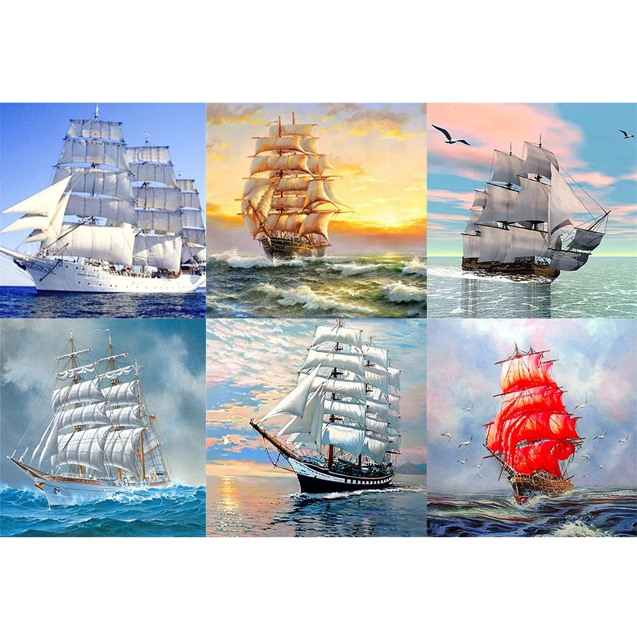 Алмазная 5D картина с квадратными кругами, полная вышивка с парусником, мозаика для ландшафта, Декор для дома
