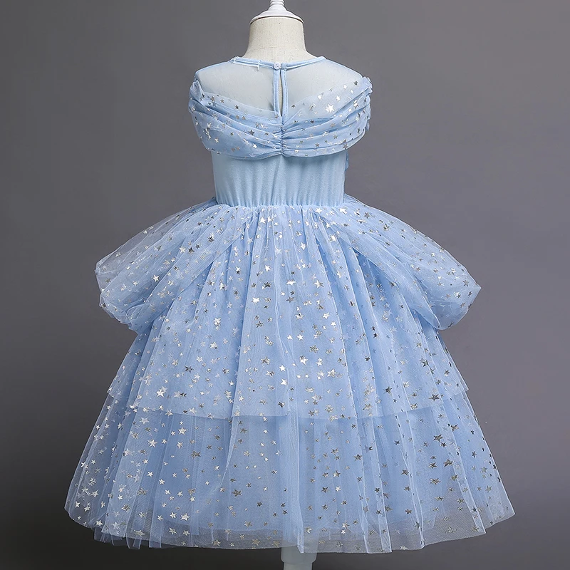 Дочке почти 10 лет, по размеру подошло идеально. У белого платья шлейф отстегивается, у голубого-пришит шлейф. Дети счастливы!