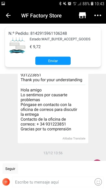Что продавец не хотел давать мне никакого решения, моя посылка говорит, что она была возвращена, и я не получил ее в любое время, и я не знаю, где она находится, я чувствую себя обманутым, потому что у меня нет денег или пакета ..... Я не рекомендую... не покупайте у этого продавца