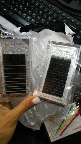 Продавец упаковал все в 1 пакет. Пришло очень быстро. Упаковано ооочень надёжно. Ресницы гланцевые, на ленте не очень плотно. Для такой цены отлично. У изгиба N непривычно большая ножка. 0.12 похоже на 0.1