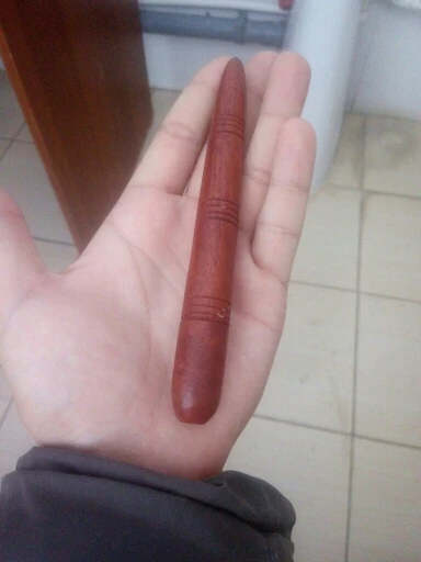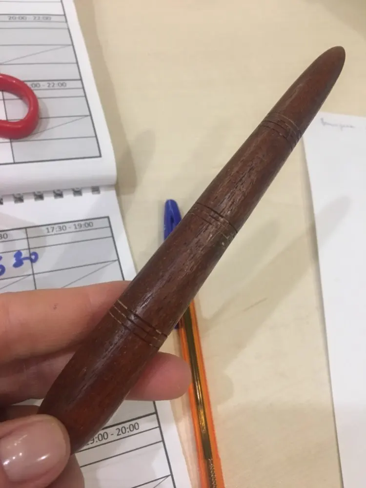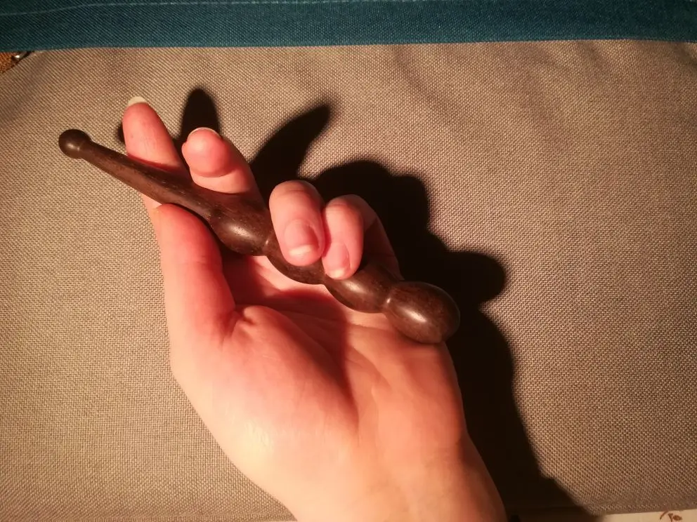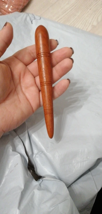 Деревянный массажёр был куплен по просьбе отца, чтобы массажировать акупунктурные точки на руках и ногах. Массажёр хорошо выточен и отполирован, поверхность гладкая и приятная на ощупь - это действительно настоящее дерево. Он небольшой, но удобно лежит в руке. Отцу, однако, больше понравился деревянный массажёр другой формы, который оказался многофункциональней. Посылка шла долго, почему-то почти месяц пролежала на российской таможне.
