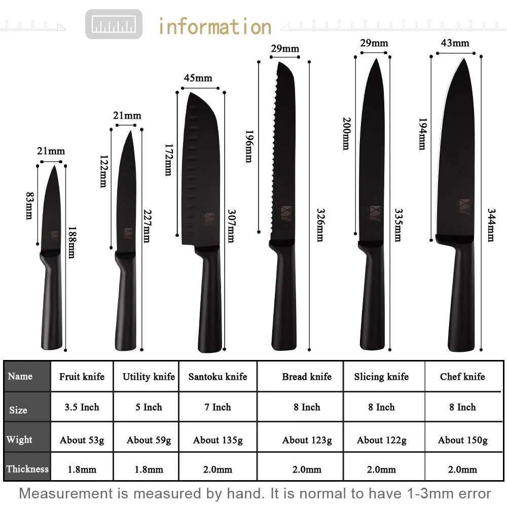 1 х 3,5 дюймовый фруктовый нож1x5 дюймов Универсальный Ножи1x7 дюймов Santoku Ножи1 х 8 дюймовый нож для хлеба1 х 8 дюймовый нож для нарезки1 x 8-дюймовый поварский нож6 чехлов для ножей