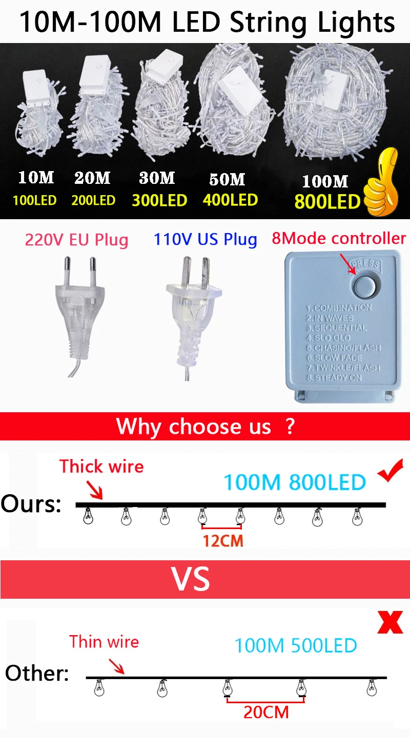 Светодиодная гирлянда на рождественскую елку, 10 м, 100 м