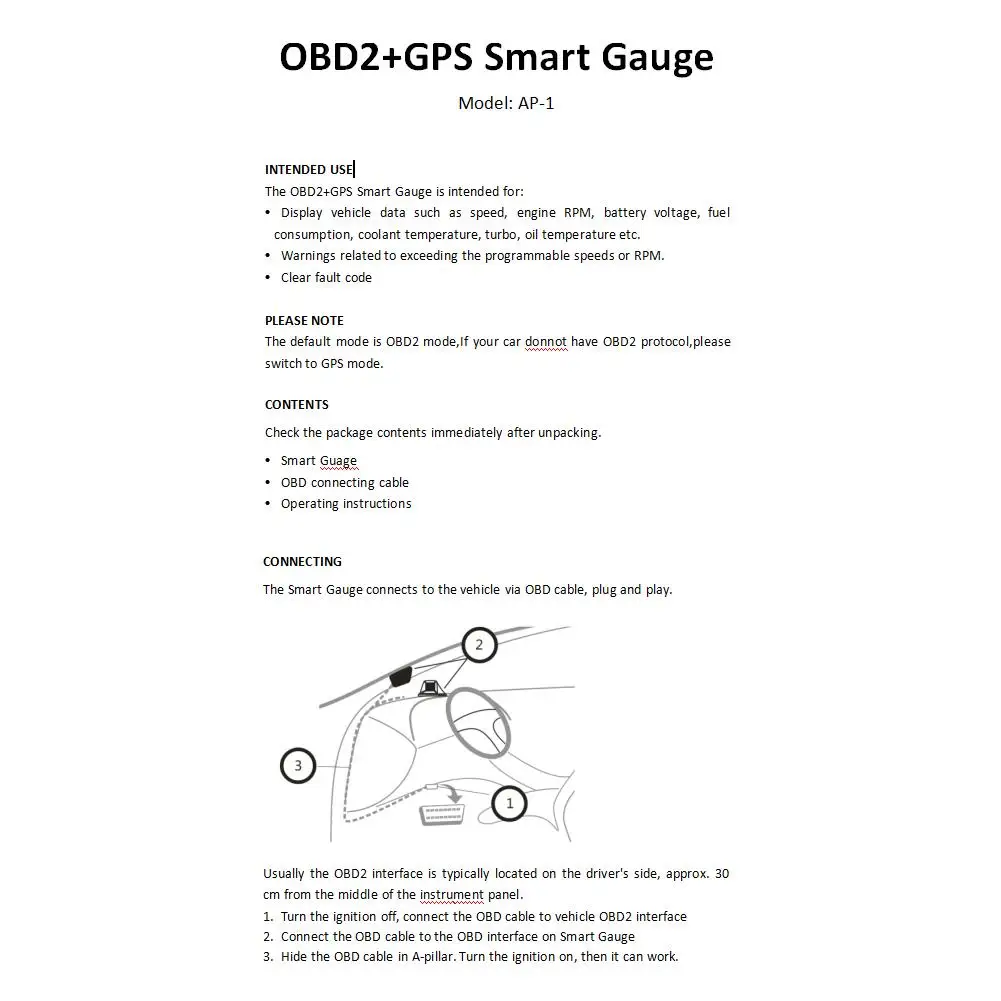 Особенности:1. Двойная система OBD + GPS.2. Два способа установки: Установка стойки + установка центральной консоли. Первый секундомер, который можно установить на стойку А.3. В настоящее время первый экран может вращаться на 270 градусов.4. Первая Небольшая Таблица кодов HUD достигает максимального разрешения 240*240 для дисплея высокой четкости.5. Есть три типа давления турбины: PSI, 100 кПа, бар. Значение турбины можно регулировать и калибровать для увеличения единицы расхода топлива км/л.6. Частота обновления до 10 Гц, задержки не будет.7. Функция GPS может отображаться одновременно в режиме OBD, который в настоящее время является первым в отрасли. Когда скорость переключается на миль/ч на милю, температура воды автоматически переключается на градусы по Фаренгейту, одинарное расстояние движения также автоматически переключается на мили, И расход топлива также будет автоматически переключен на галлоны MPG.8. Можно переключать 8 видов экранов.9. Функция: Режим OBD2: скорость, об/мин, температура воды, напряжение, расход топлива, часы, расстояние одиночного перемещения, время одиночного перемещения, температура масла, давление турбины, Испытание на ускорение, испытание тормозов, оповещение о превышении скорости, оповещение о сбое двигателя, устранение кода неисправности, оповещение о температуре воды, оповещение о скорости, Сигнализация напряжения, переключатель мили, напоминание о усталости вождения, автоматическая и ручная регулировка яркости.10. Режим GPS: скорость в час, высота, количество спутников, часы, пробег в одной поездке, время в одной поездке, компас.Спецификация:Материал: АБСЦвет: черныйСистема: OBD + GPSРазмер экрана: 2-дюймовый ЖКРазрешение экрана: 240*240Размер чистого металла: около 9,7*6,1*4,9 см/3,82*2,40*1,93 дюймаВес Чистого металла: около 40 гДлина кабеля: 175 смПрименение: все моделиУпаковочный лист:1 хост1 кабель OBD21 х крючок и петля