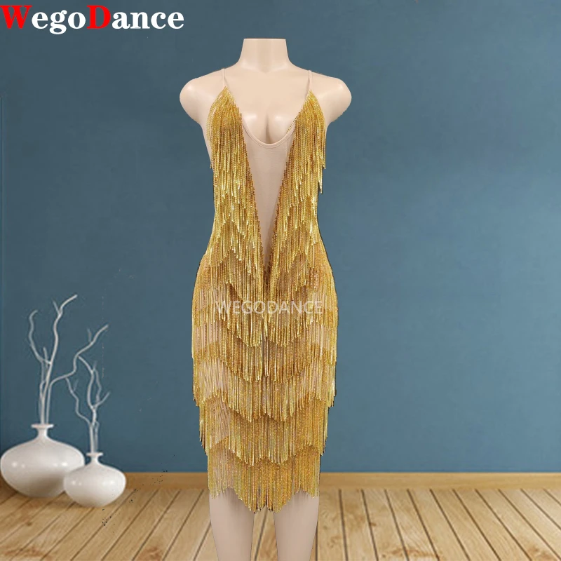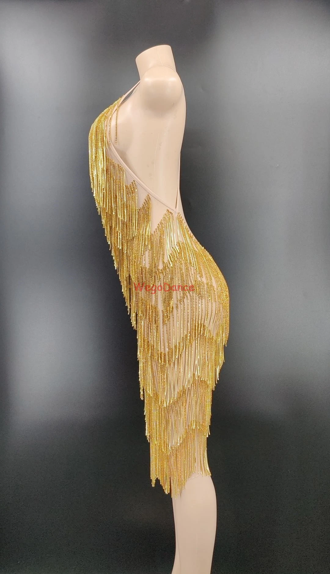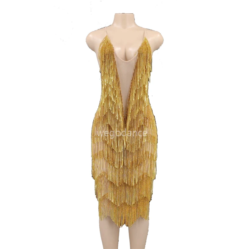 Сексуальное летнее женское короткое платье с открытой спиной и кисточками, Золотое Платье на бретельках, вечерний пляжный сарафан для вечеринки