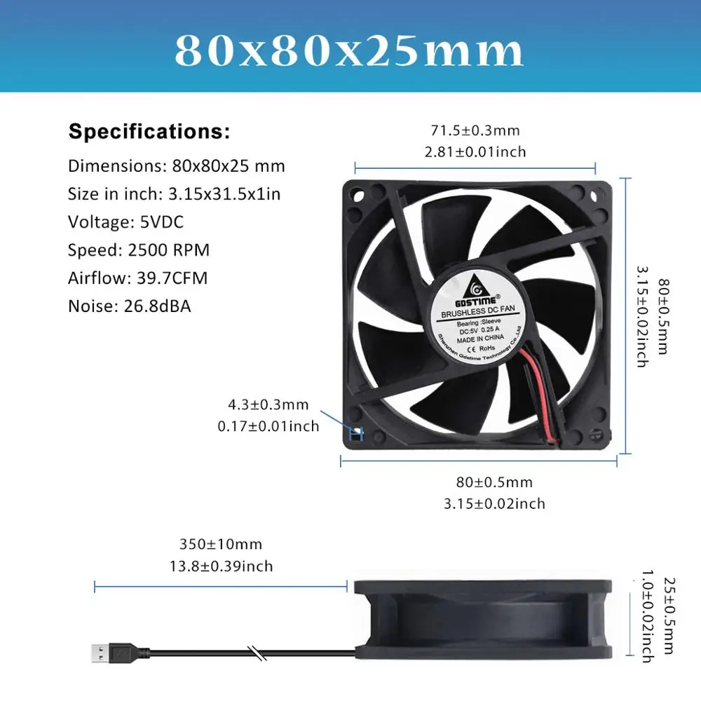 Вентилятор бесщеточный Gdstime 8015, 5 в пост. Тока, USB, 80x80x15 ...