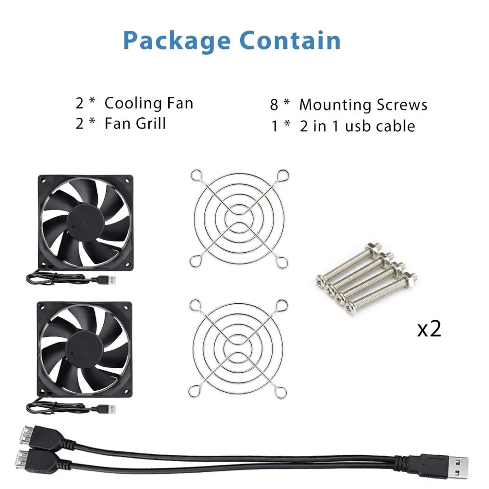 Посылка включает в себя: 2 шт. вентилятор + 2x80 мм защитная сетка вентилятора + 8x винты + 1x2 в 1 USB кабель