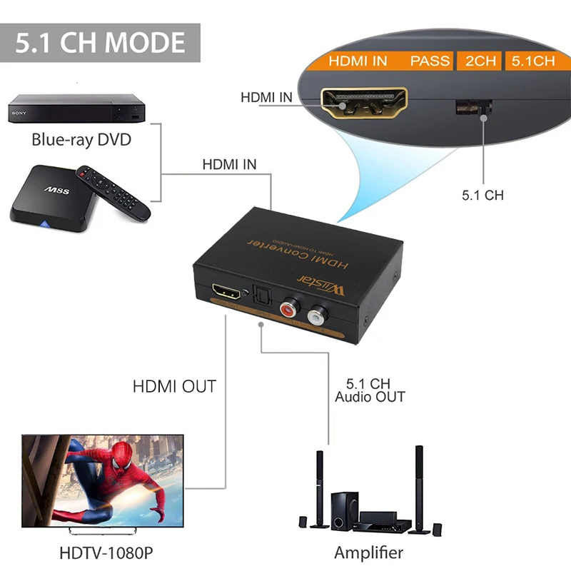 Wiistar hdmi к hdmi & R/L Spdif аудио 2,1/5.1CH hdmi аудио экстрактор HDMI аудио экстрактор конвертер оптический Toslink RCA L/R