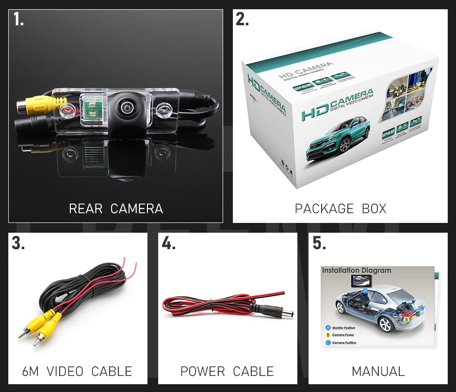 1. CVBS/AHD камера заднего вида2. Коробка для посылка3. Видео кабель 6 м4. Кабель питания5. Руководство пользователя