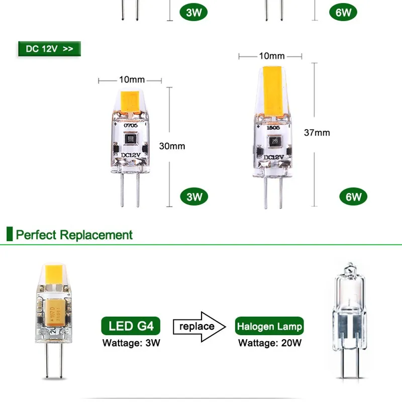 -Мощность: 3 Вт, 6 Вт -Тип основания: G4 -Модель светодиодного чипа: COB светодиодный -Угол свечения: 360 градусов -Цветовая температура: теплый белый: 2800-3200K, холодный белый: 6000-65500K