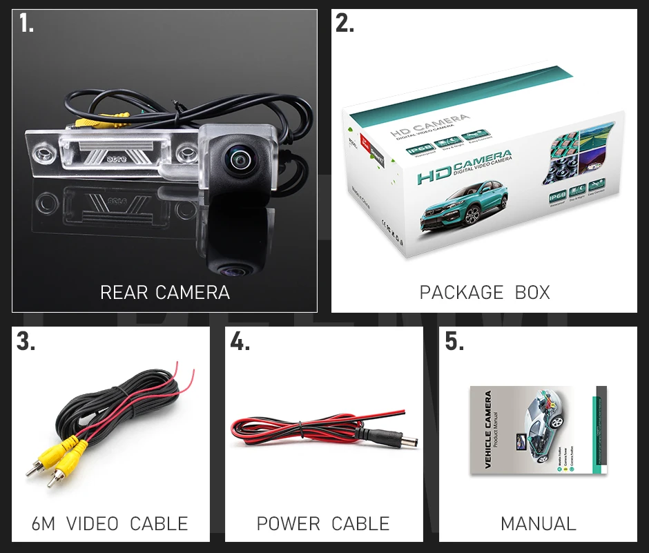 1. Задняя камера2. Коробка для посылка3. Видео кабель (6 м)4. Кабель питания5. Руководство пользователя
