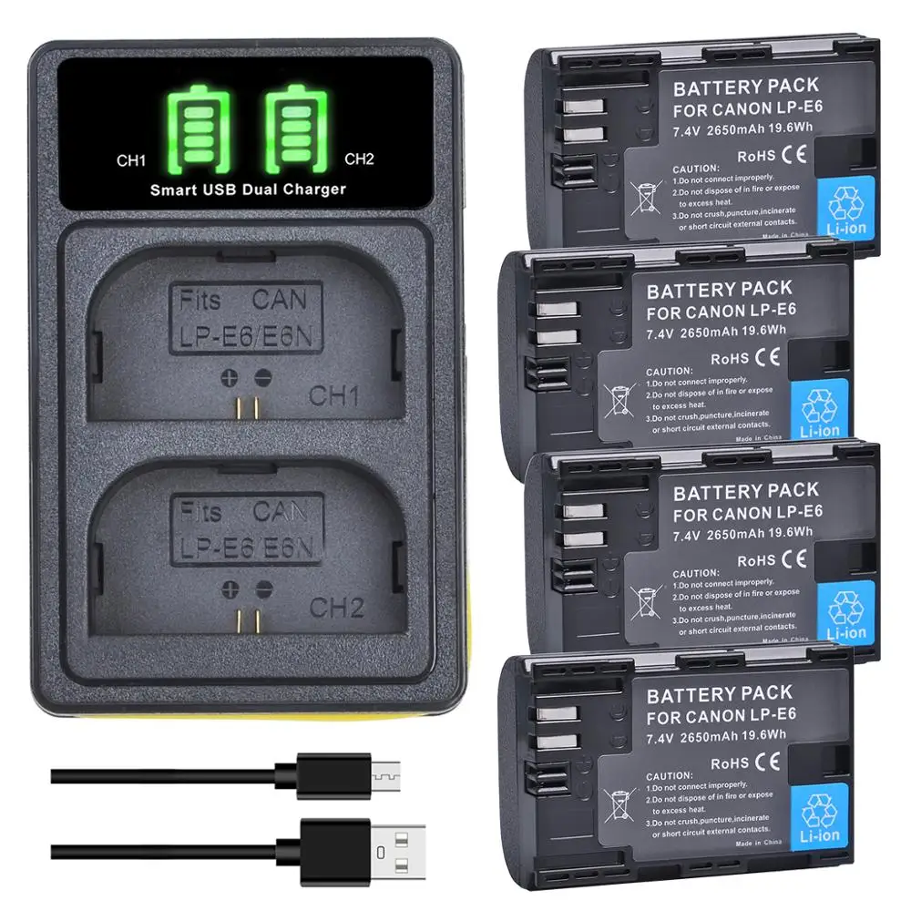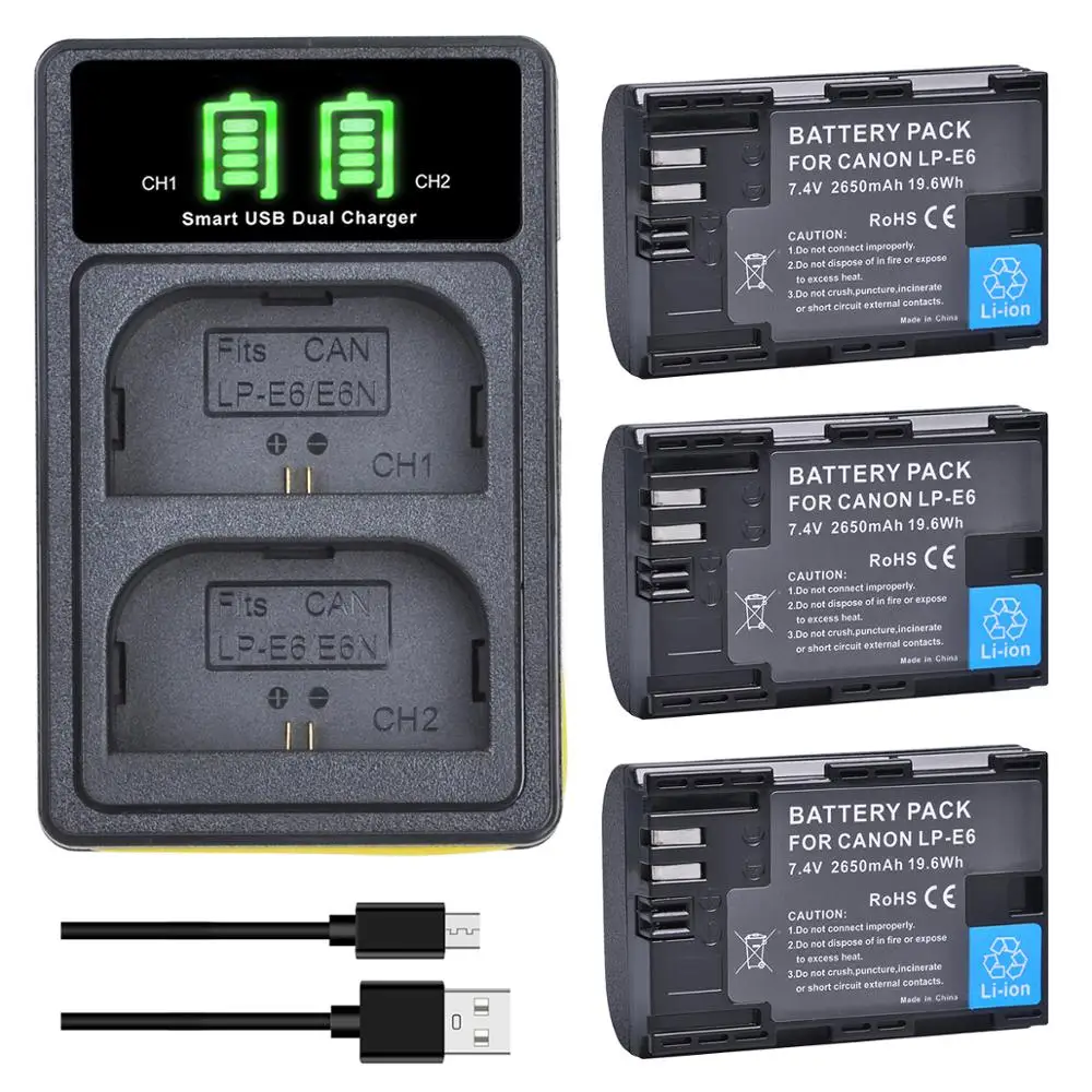 Семейное зарядное устройство E6N, совместимое с Canon EOS 5D Mark II, III, IV, 6D, 60D,6D Mark II, 7D Mark II,70D, 80D 2650 мАч