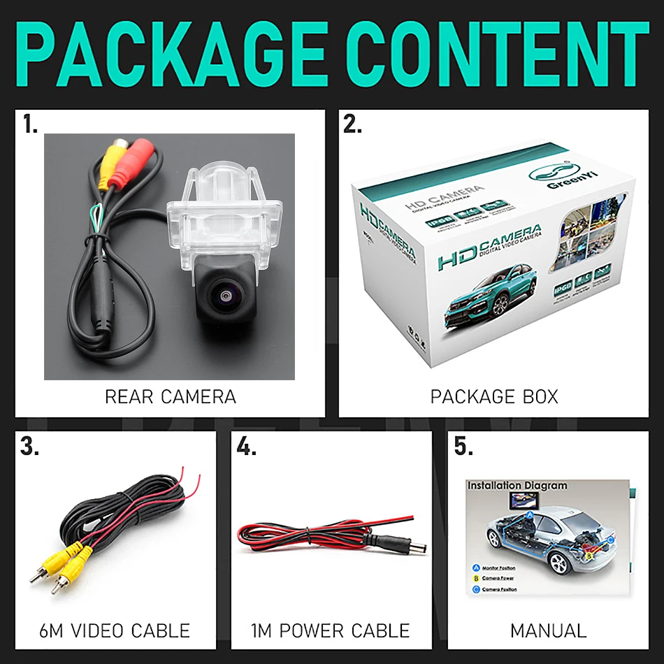 1. CVBS/AHD камера заднего вида2. Коробка для посылка3. Видео кабель 6 м4. Кабель питания5. Руководство пользователя