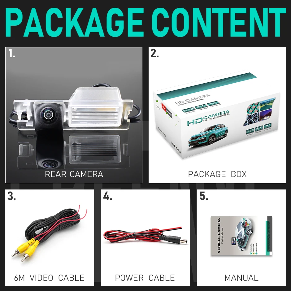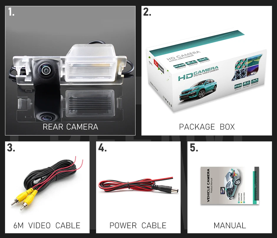 1. Задняя камера2. Коробка для посылка3. Видео кабель (6 м)4. Кабель питания5. Руководство пользователя