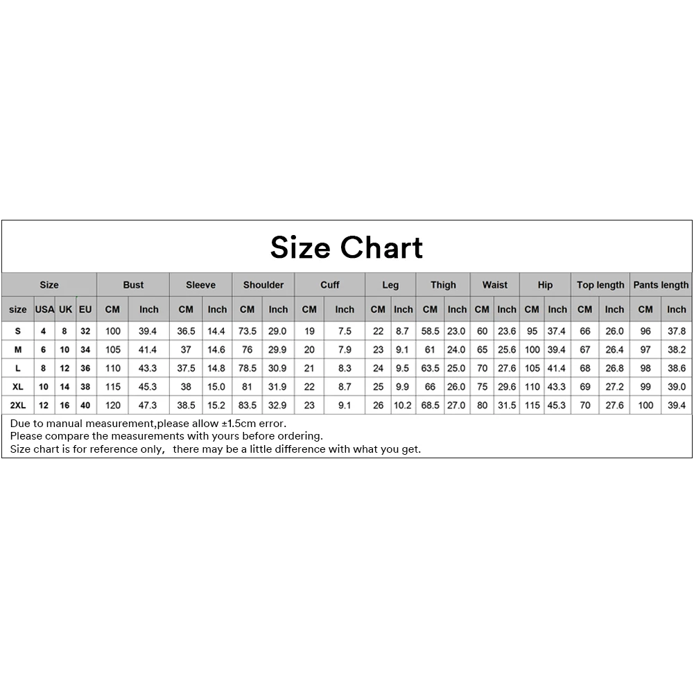 Женский спортивный костюм с длинным рукавом и круглым вырезом Характеристики: Светильник, мягкая и приятная для кожи. Длинный спортивный костюм позволяет влюбиться в упражнения даже в холодную погоду. Этот спортивный костюм подходит для пляжа, занятий спортом, путешествий, покупок, повседневной носки и т. д. Тип: блузка + брюки Тип размера: Обычный Пол: женщин Материал: смесь хлопка Длина рукава: длинный рукав Тип шеи: круглый вырез Стиль: спортивный, повседневный Уход За Одеждой: ручная стирка Особенности: однотонный, с карманами, кулиской Детали размера Таблица размеров блузки [Наш Размер S] Бюст: 100 см/39,4 дюйма, Плечи: 73,5 см/29,0 дюйма, рукав: 36,5 см/14,4 дюйма, Манжеты: 19 см/7,5 дюйма, длина: 66 см/26,0 дюйма (прибл.) [Наш Размер M] Бюст: 105 см/41,4 дюйма, Плечи: 76 см/29,9 дюйма, рукав: 37 см/14,6 дюйма, Манжеты: 20 см/7,9 дюйма, длина: 67 см/26,4 дюйма (прибл.) [Наш Размер L] Бюст: 110 см/43,3 дюйма, Плечи: 78,5 см/30,9 дюйма, рукав: 37,5 см/14,8 дюйма, Манжеты: 21 см/8,3 дюйма, длина: 68 см/26,8 дюйма (прибл.) [Наш Размер XL] Бюст: 115 см/45,3 дюйма, Плечи: 81 см/31,9 дюйма, рукав: 38 см/15,0 дюйма, манжеты: 22 см/8,7 дюйма, длина: 69 см/27,2 дюйма (прибл.) [Наш Размер 2XL] Бюст: 120 см/47,3 дюйма, Плечи: 83,5 см/32,9 дюйма, рукав: 38,5 см/15,2 дюйма, Манжеты: 23 см/9,1 дюйма, длина: 70 см/27,6 дюйма (прибл.) Таблица размеров брюк [Наш Размер S] Длина: 96 см/37,8 дюйма, Талия: 60 см/23,6 дюйма, бедра: 95 см/37,4 дюйма, бедра: 58,5 см/23,0 дюйма, нога: 22 см/8,7 дюйма (прибл.) [Наш Размер M] Длина: 97 см/38,2 дюйма, талия: 65 см/25,6 дюйма, бедра: 100 см/39,4 дюйма, бедра: 61 см/24,0 дюйма, нога: 23 см/9,1 дюйма (прибл.) [Наш Размер L] длина: 98 см/38,6 дюйма, талия: 70 см/27,6 дюйма, бедра: 105 см/41,4 дюйма, бедра: 63,5 см/25,0 дюйма, нога: 24 см/9,5 дюйма (прибл.) [Наш Размер XL] Длина: 99 см/39,0 дюйма, талия: 75 см/29,6 дюйма, бедра: 110 см/43,3 дюйма, бедра: 66 см/26,0 дюйма, нога: 25 см/9,9 дюйма (прибл.) [Наш Размер 2XL] Длина: 100 см/39,4 дюйма, талия: 80 см/31,5 дюйма, бедра: 115 см/45,3 дюйма, бедра: 68,5 см/27,0 дюйма, нога: 26 см/10,2 дюйма (прибл.) Примечания: Пожалуйста, обратитесь к нашей таблице размеров и выберите правильный размер. Из-за разницы в освещении и настройках экрана цвет изделия может немного отличаться от изображения. Посылка входит: 1 х блузка 1 х брюки (другие не включены)