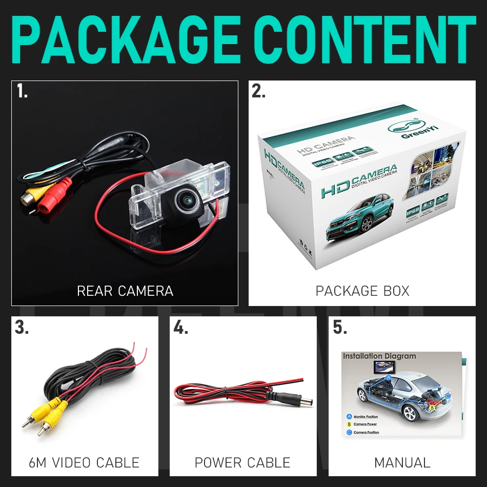 1. Задняя камера2 посылка3. Видеокабель (6 м)4. Кабель питания5. Руководство