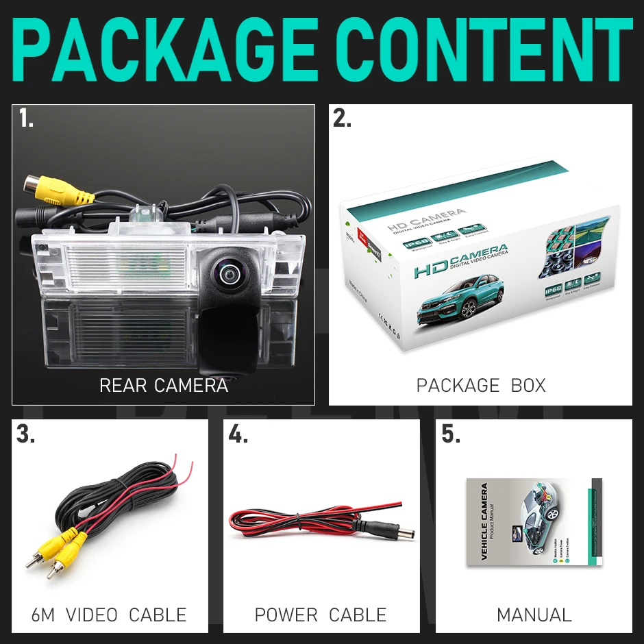 1. Задняя камера2. Коробка для посылка3. Видео кабель (6 м)4. Кабель питания5. Руководство пользователя