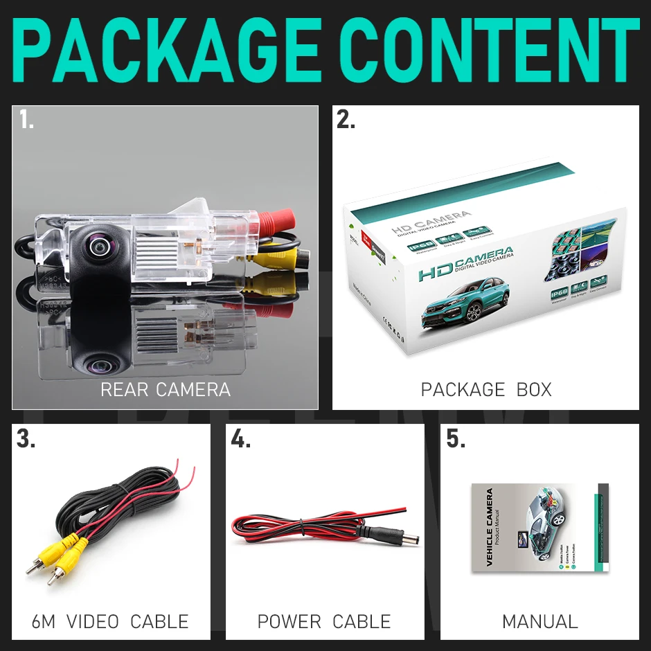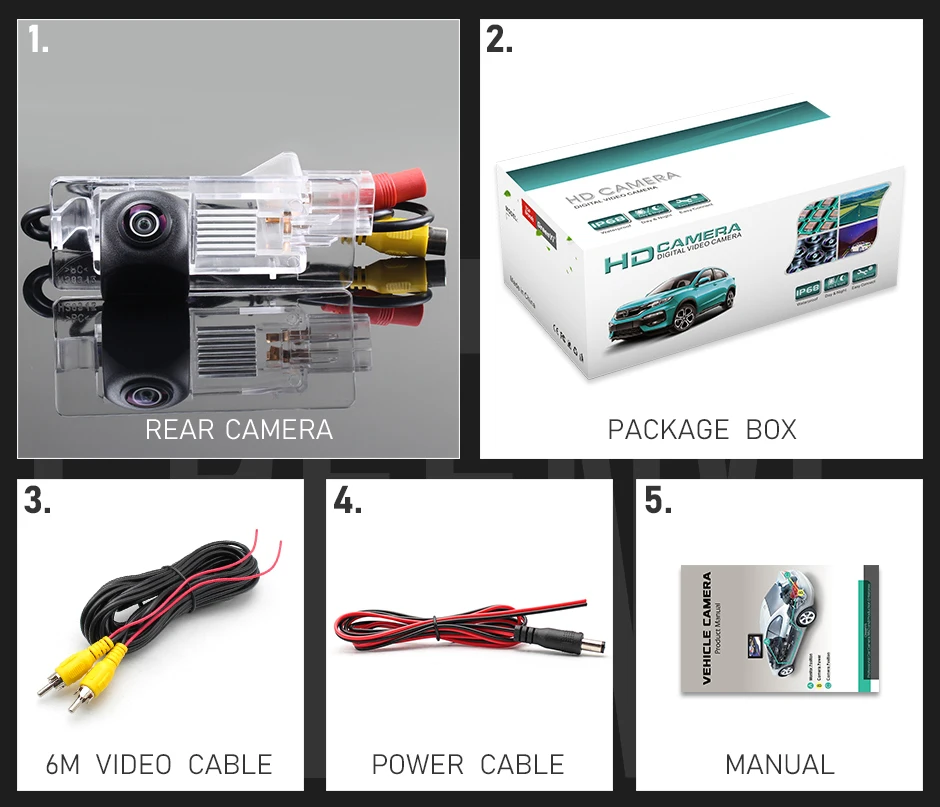 1. Задняя камера2 посылка3. Видеокабель (6 м)4. Кабель питания5. Руководство