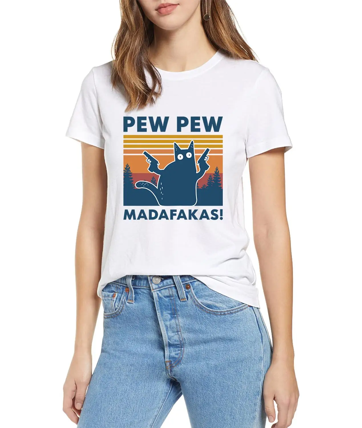 Черная кошка Pew Madafakas забавная кошка Гангстер с пистолетом мемом Ретро Женская футболка с коротким рукавом юмор подарок Топы Футболка Прямая поставка