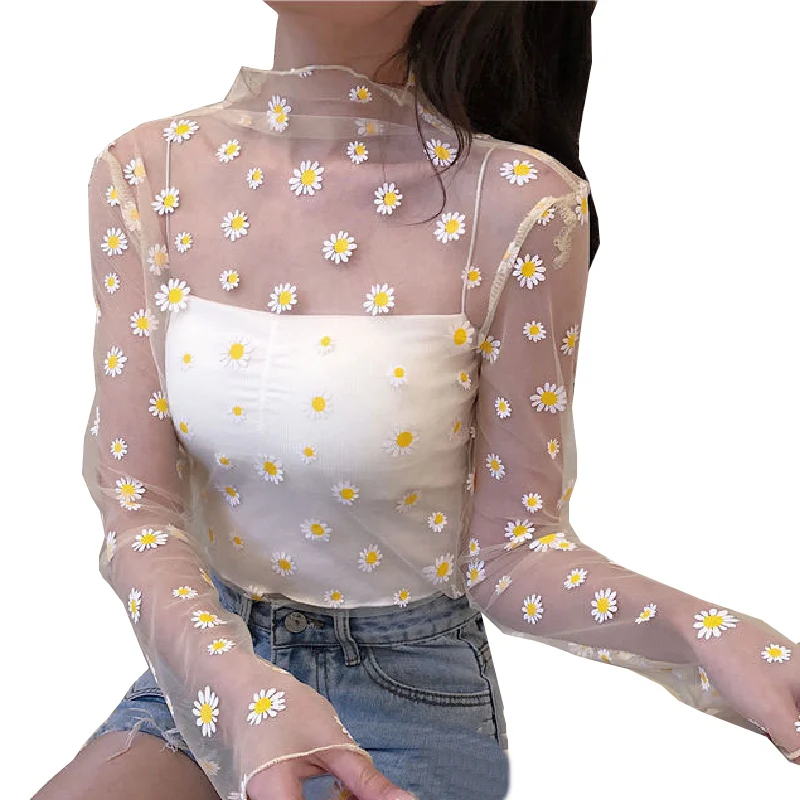 Женская прозрачная Сетчатая футболка, Повседневная Черная Кружевная футболка с длинным рукавом и в горошек со звездами, 2020