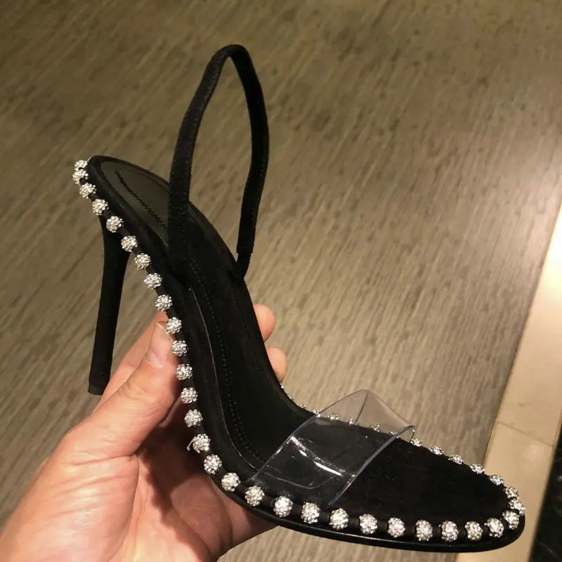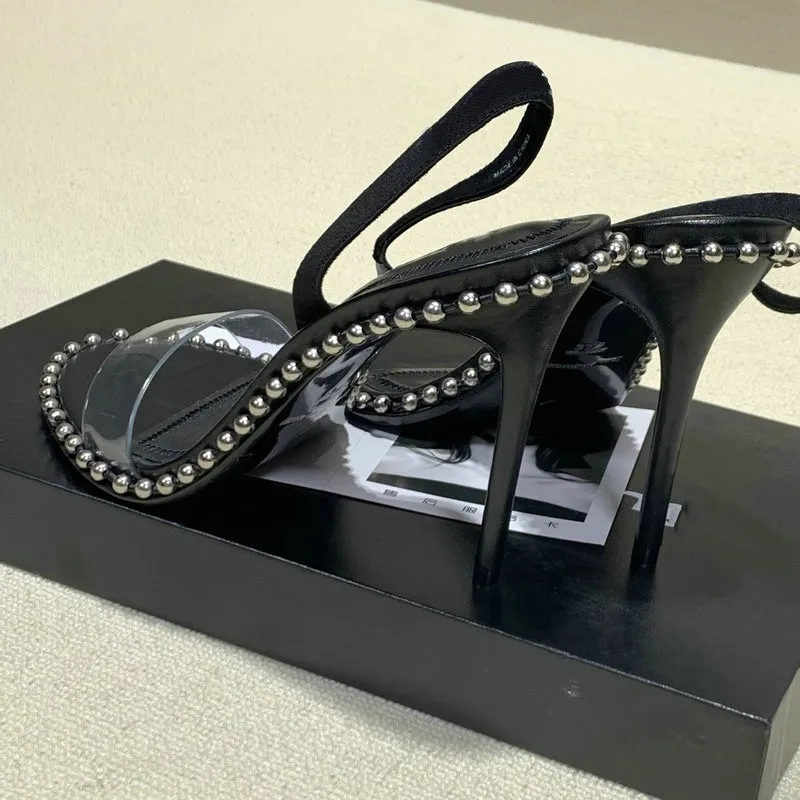 Летние римские сандалии на высоком каблуке из ПВХ с заклепками, Украшенными Бисером, искусственная кожа и открытым носком, сексуальные стильные ретро сандалии
