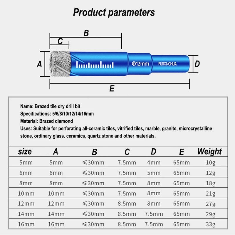 Применение: подходит для перфорации керамической плитки, остекленной плитки, мрамора, гранита, микрокристаллического камня, обычного стекла, керамики, кварцевого камня и других материалов.