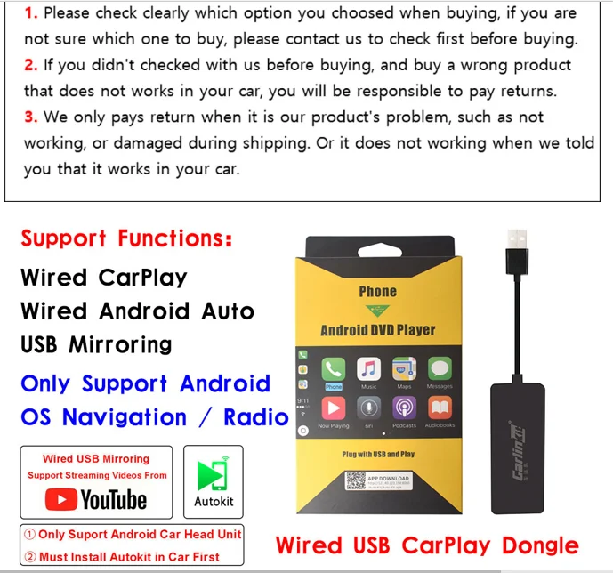 Примечание: мы рекомендуем вам связаться с нами перед покупкой, чтобы убедиться, что ваш carplay и мобильный телефон могут использовать этот продукт, спасибо за ваше понимание и сотрудничество