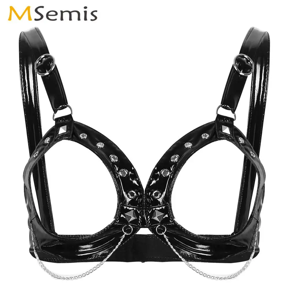 Женские готические бюстгальтеры в стиле панк с металлическими цепочками, эротические бюстгальтеры из лакированной кожи, открытый бюстгальтер без косточек, сексуальное нижнее белье