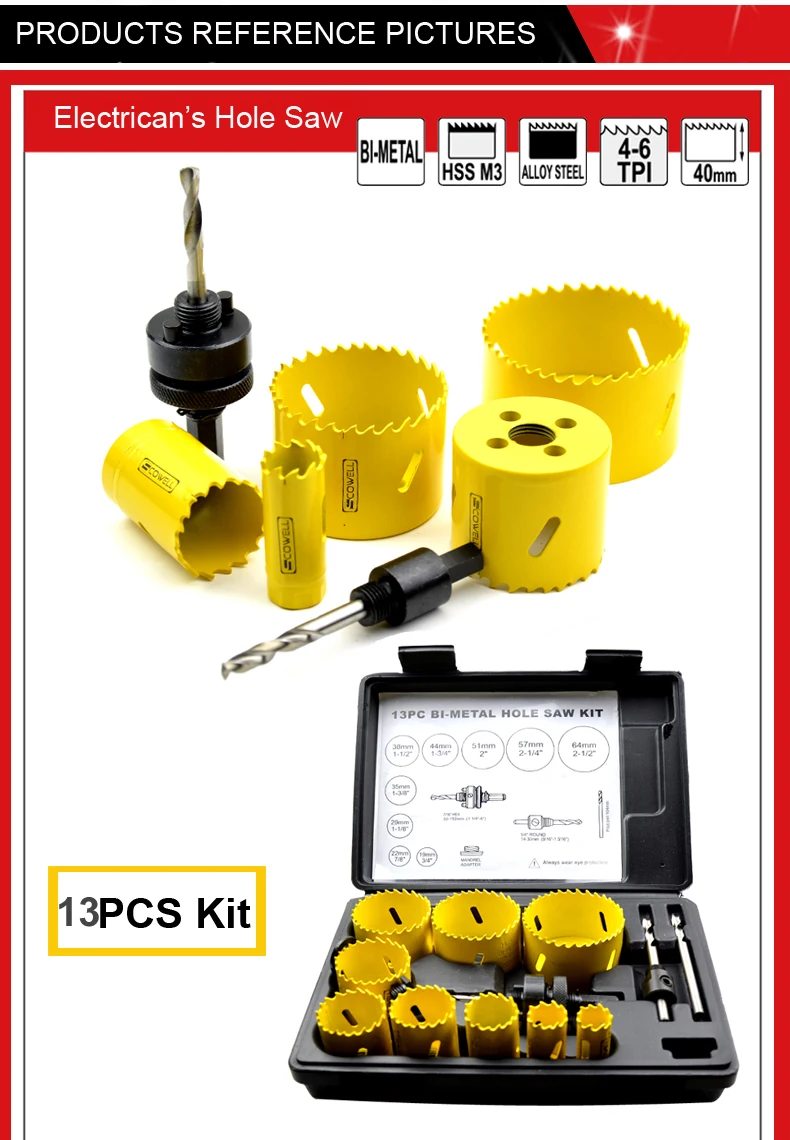 1. Размер диаметра: 19 мм (3/4 "), 22 мм (7/8"),29 мм (1-1/8 "),35 мм (1-3/8"),38 мм (1-1/2 "),44 мм (1-3/4"),51 мм (2 "),57 мм (2-1/4"),64 мм (2-1/2 ") 2. Глубина резки: 38 мм 3. Размер беседки: шестигранный хвостовик A2,A7 4. Изготовлен из Би-металла M3, подходит для резки нержавеющей стали, стали, железа, сплава, дерева, пластика, гипсокартона и s на 5. Цвет основан на нашем складе