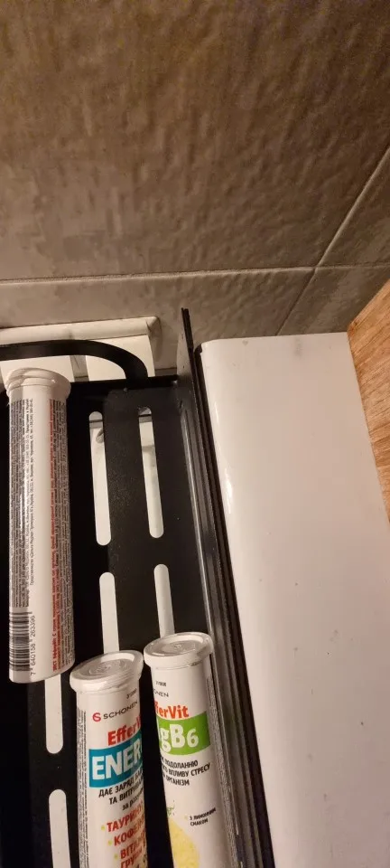 Отличная полка, хороший магнит. Выглядит надёжно. Боялась, что деревянная вставка будет выпадать, но потом нашла в комплекте резинки-уплотнители.