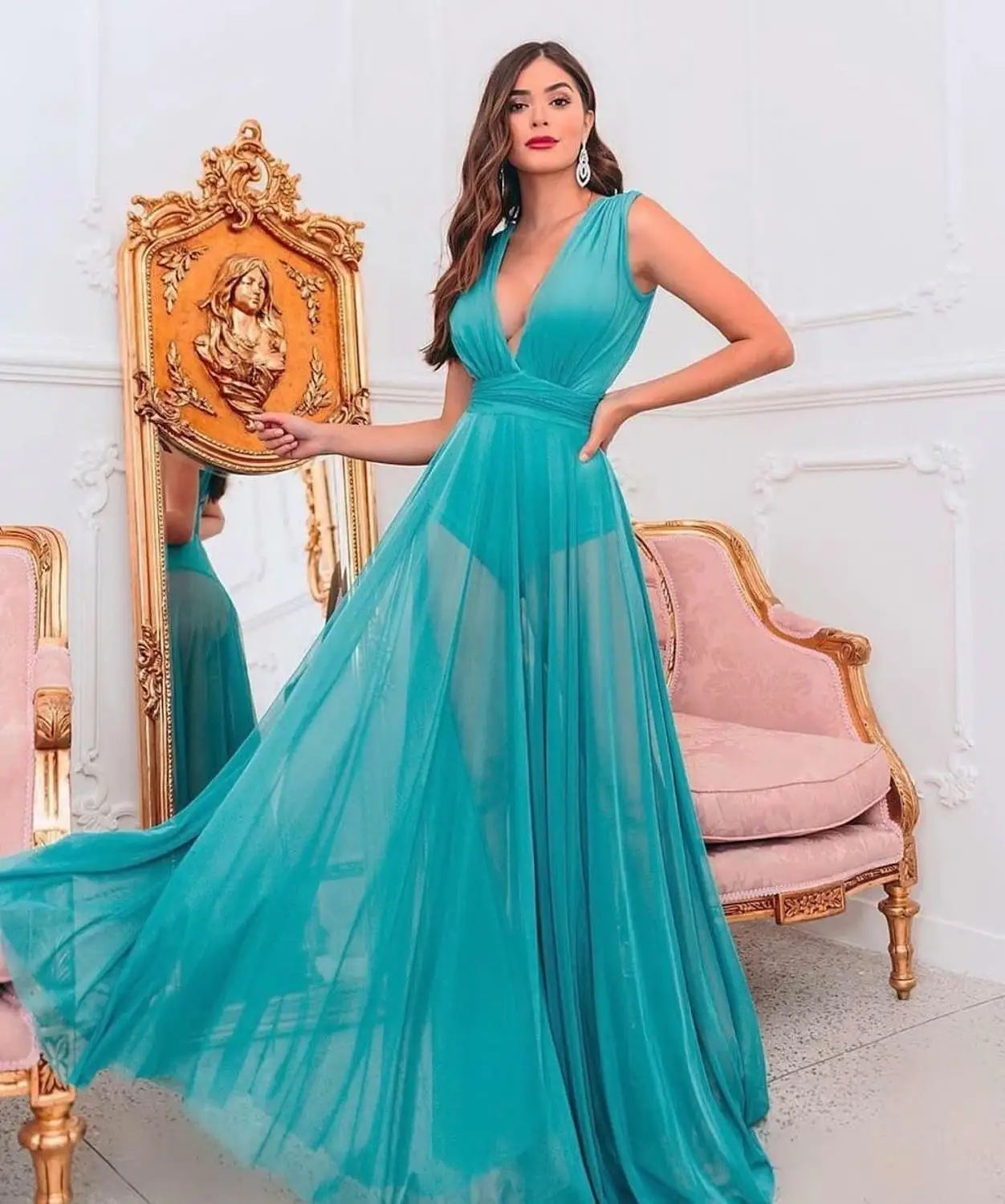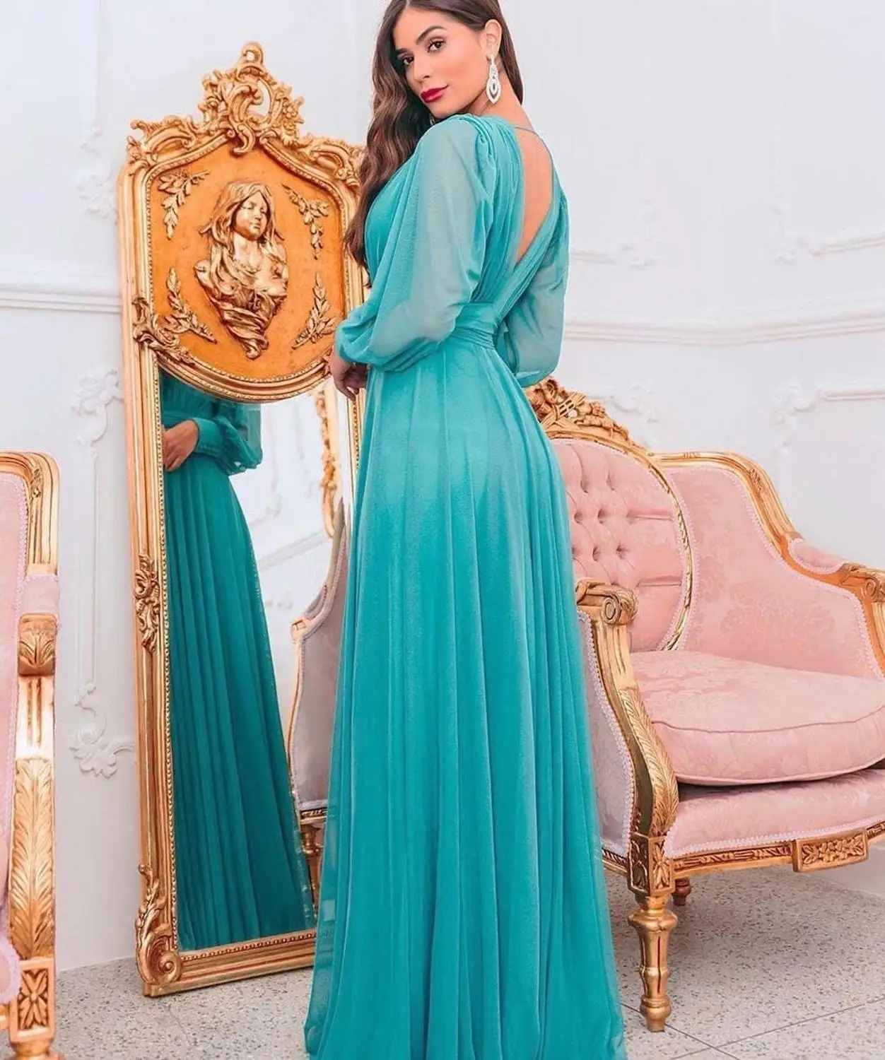 Женский прозрачный длинный халат с оттенком зеленого цвета, пушиста...