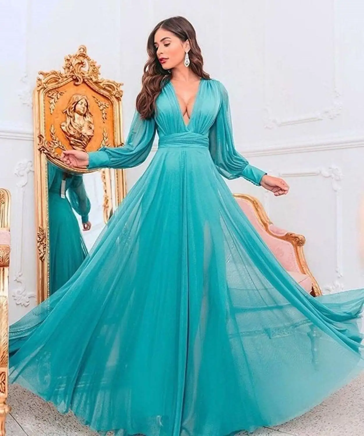 Женская ночная рубашка, на заказ, с V-образным вырезом, длинными рукавами, прозрачная, со шлейфом, 2020, для выпускного вечера, размера плюс